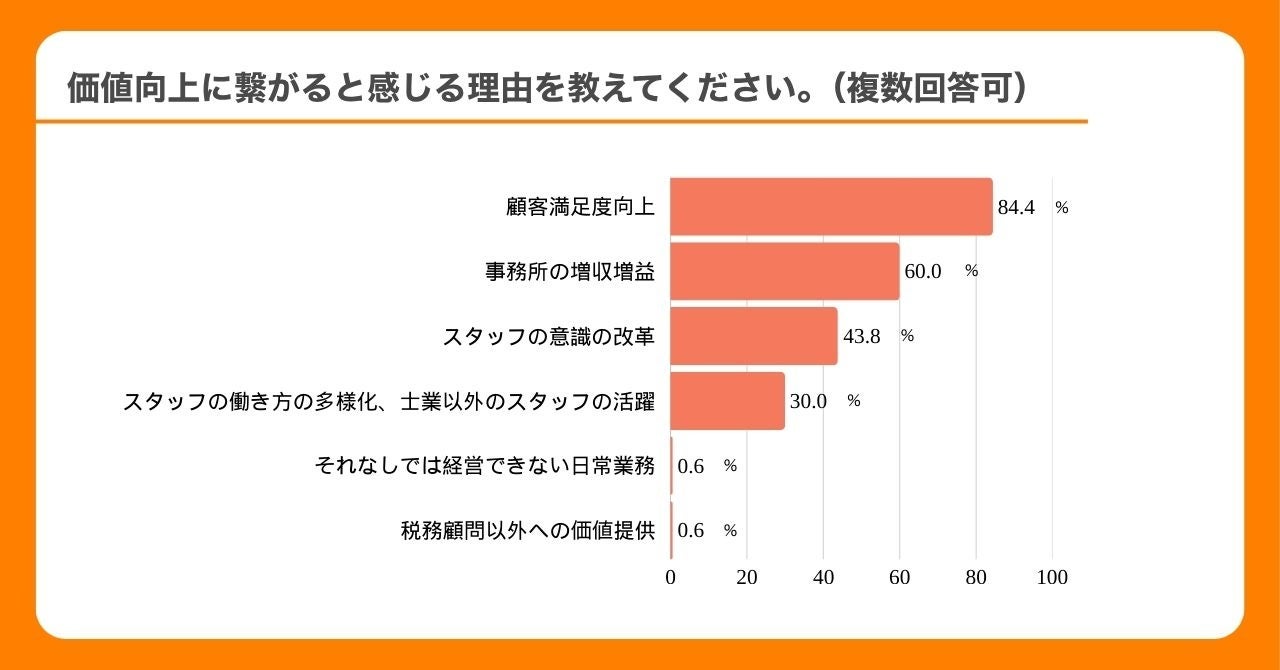 未来会計を導入したことが事務所の価値向上に繋がったかどうか聞いたところ、68.3%が「はい」と回答。その理由として多かった回答が、「顧客満足度向上」(84.4%)、
