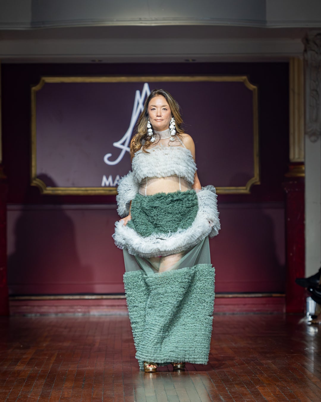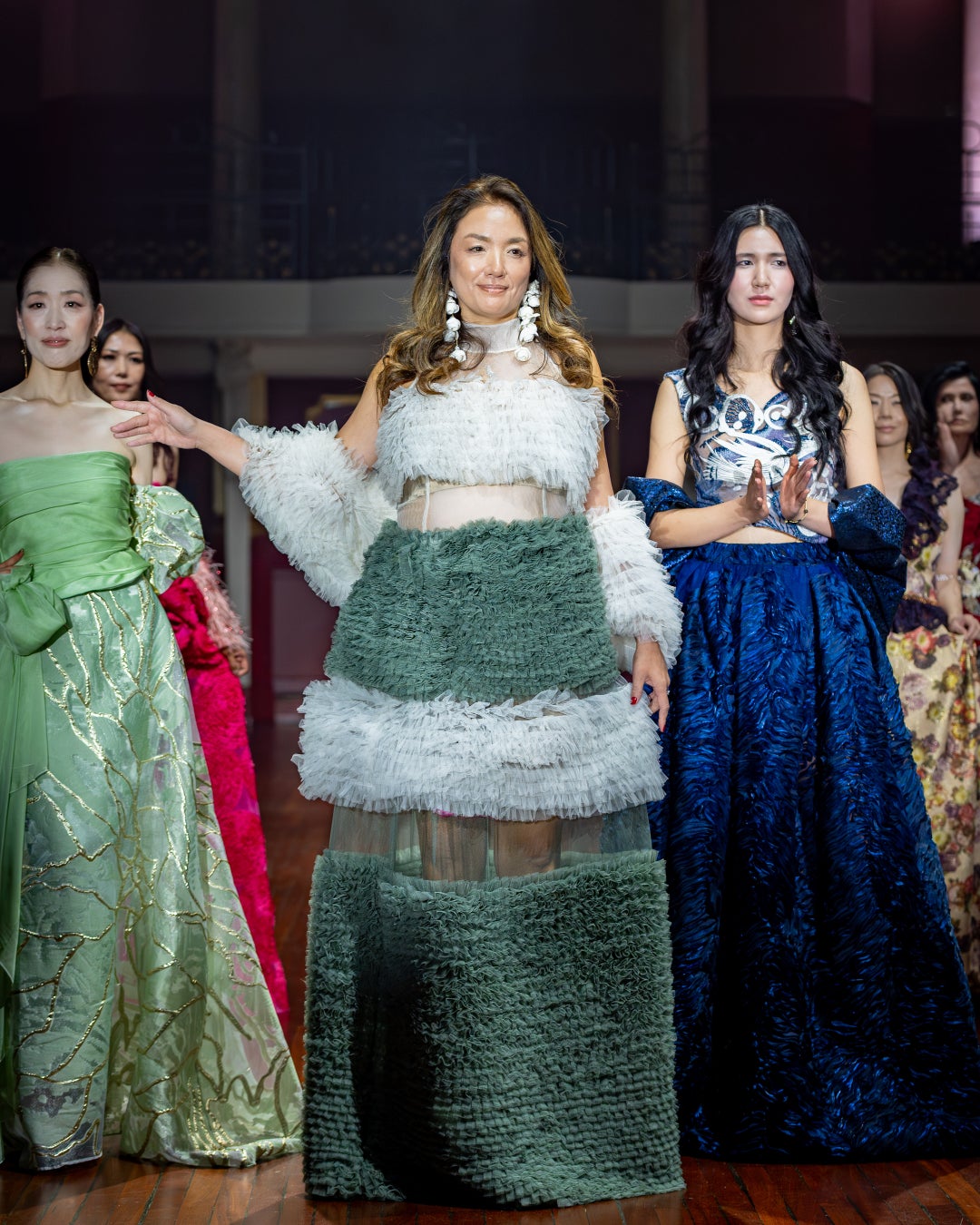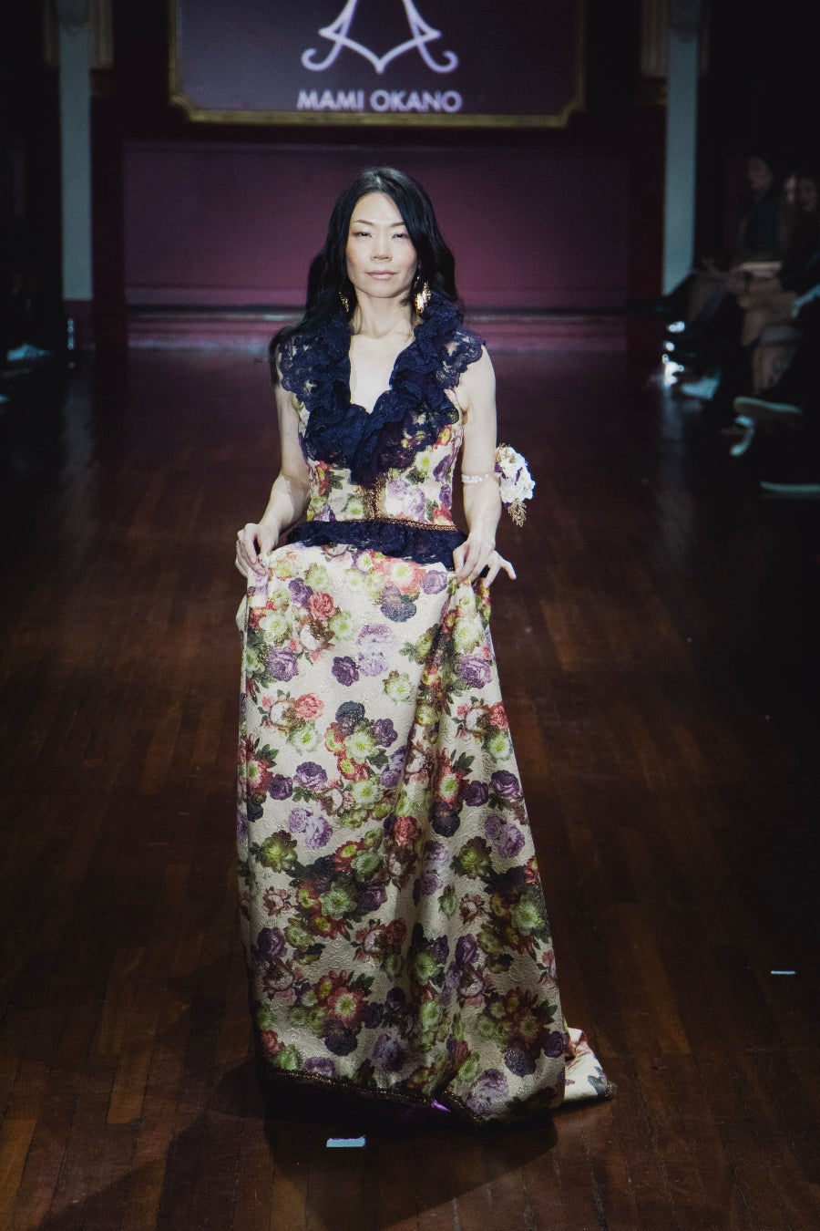 MAMI OKANOのドレスを纏い、「ランウェイを通して、すべての女性の夢と可能性を照らしたい」というMAMIの想いに共鳴し、年齢や常識にとらわれない“生き方としての美”をランウェイで体現した。