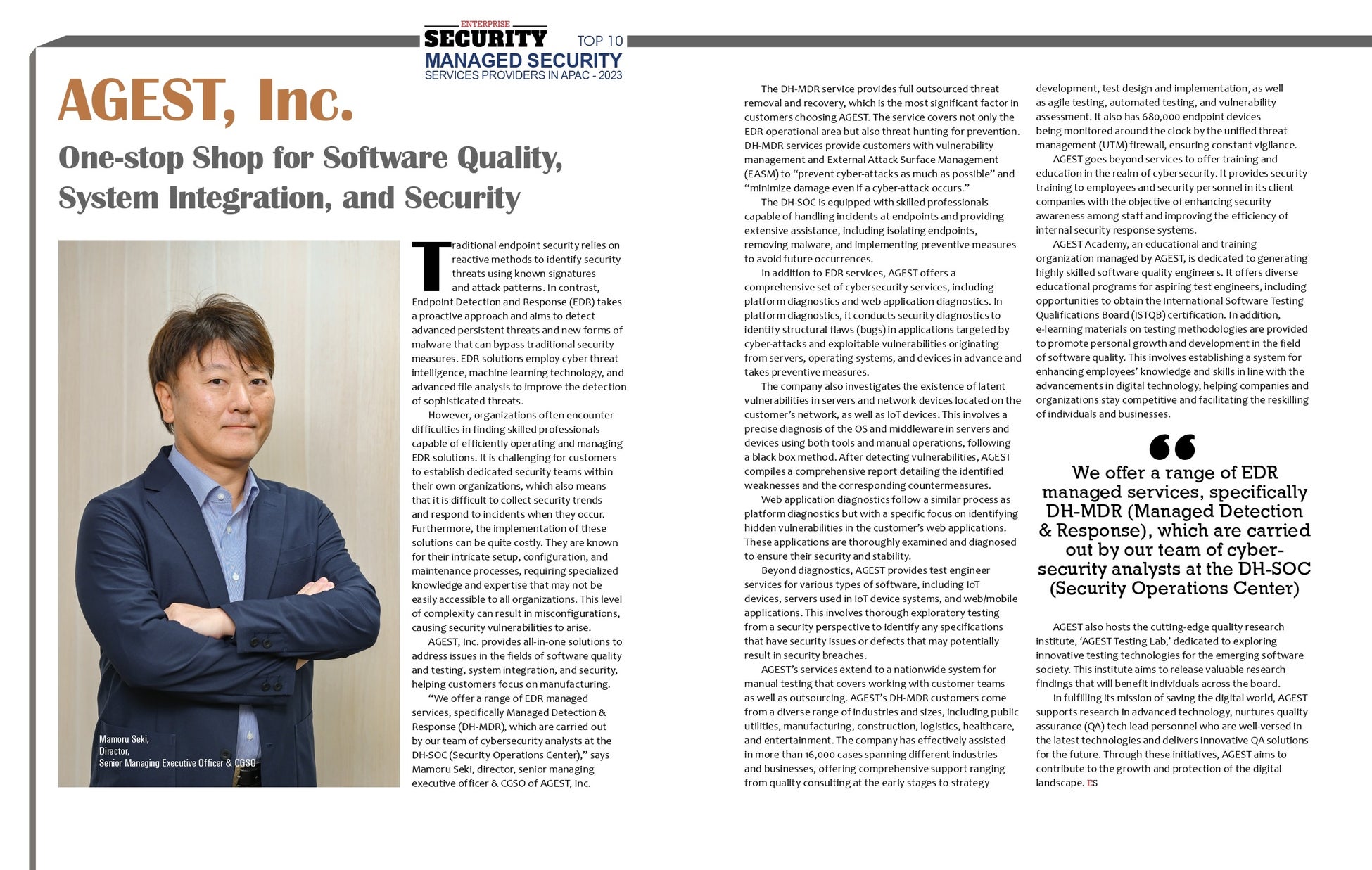 先端品質テクノロジーを活用してソフトウェアの品質・安全性向上を支援する株式会社AGEST(本社: 東京都文京区、代表取締役 社長執行役員 CEO: 二宮 康真、以下、「AGEST」)は、サイバーセキュリティ技術情報誌『Enterprise Security Magazine』の「Top10 Managed Security Services Provirers in APAC - 2023」に選出されました。