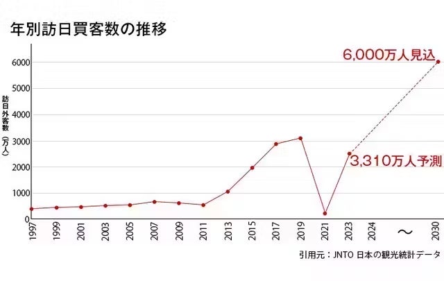 日本政府観光局の発表によると、コロナ禍明け以降、訪日外国人は2019年の3188万人から2024年には3310万人へ増加し、2030年には6000万人に達すると予測されています。