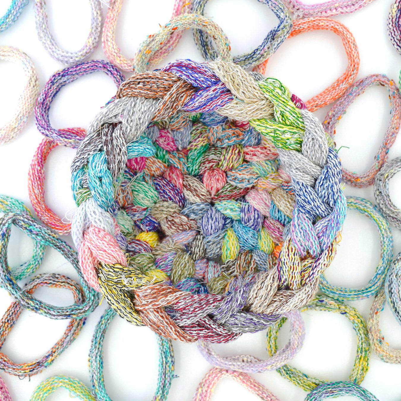 S.Laboでは、靴下の製造工程で発生する端材や残糸を廃棄せず、創造的に再利用する「アップサイクル」の取り組みを行っております。今回のワークショップで使用する「ソックループ」も、その一例です。 「ソックループ」とは、筒状に編み上げた靴下のつま先部分を専用ミシンで縫製する際に切り落とされる、わっか状の端材を指します。通常は廃棄される素材ですが、色合いや柔らかな質感を活かし、靴下工場ならではの方法で再活用しております。