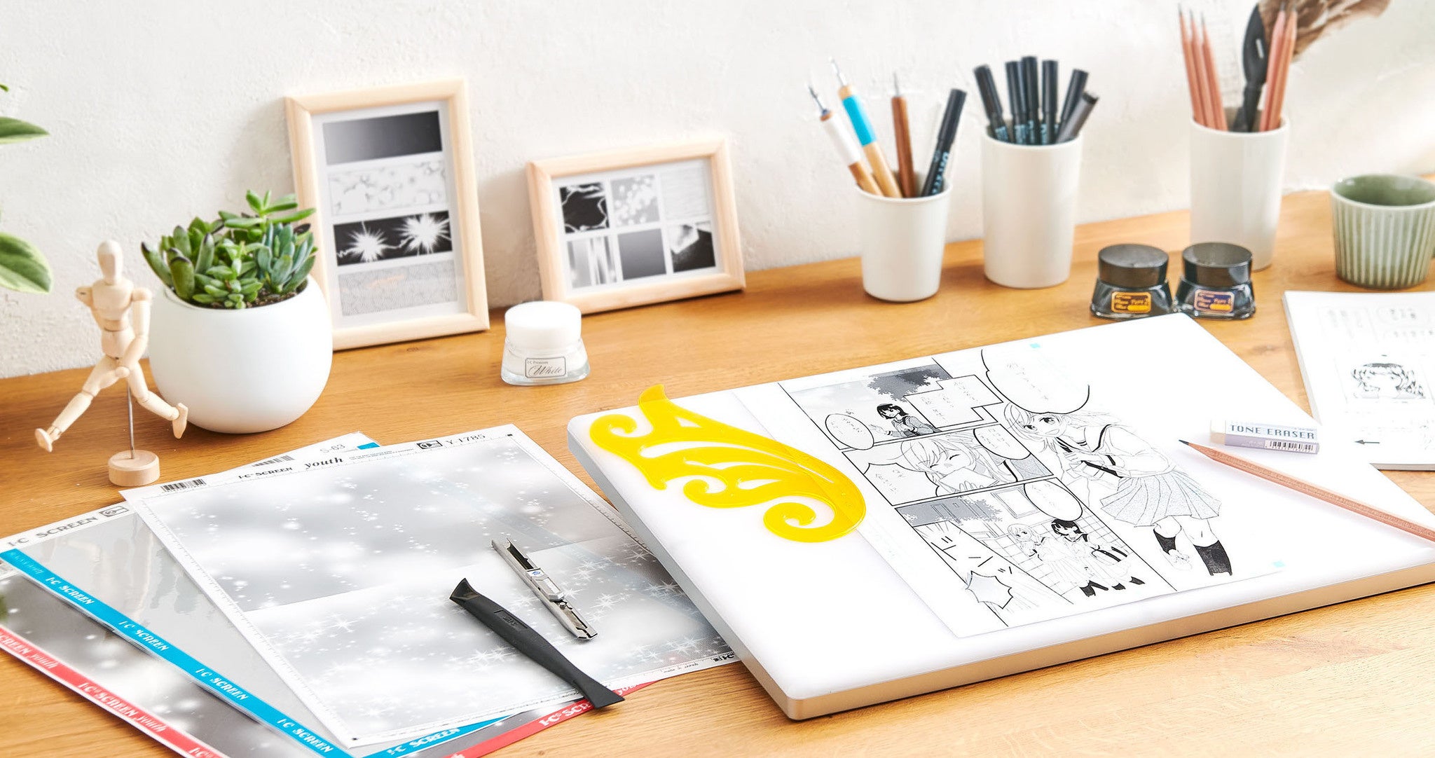 アイシーは、Tooグループの漫画画材のブランドです。主力製品である「アイシースクリーン」、「アイシー漫画原稿用紙」をはじめ、つけペン用のインクやトレーサー(ライトボックス)など、手描き漫画制作用のツールを広く揃えております。