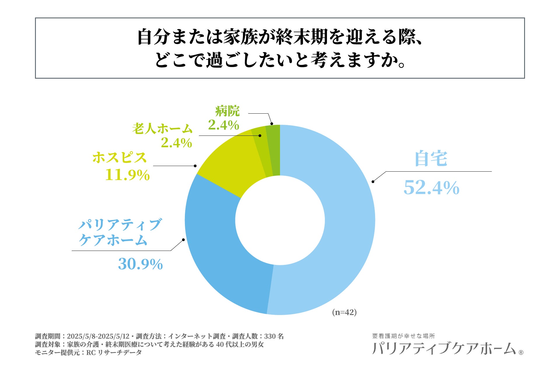 次に、「パリアティブケア」という言葉を知っていると回答された方(「聞いたことはある」と回答された方も含む)に、「自分または家族が終末期を迎える際、どこで過ごしたいと考えるか」を尋ねる設問の回答では、1位が「自宅」で52.4%、2位が「パリアティブケアホーム」で30.9%、3位が「ホスピス」で11.9%という結果になりました。この結果から、半数以上は「自宅」で過ごしたいと考えているものの、「パリアティブケアホーム」で過ごしたいと考えている人も3割以上いることがわかりました。