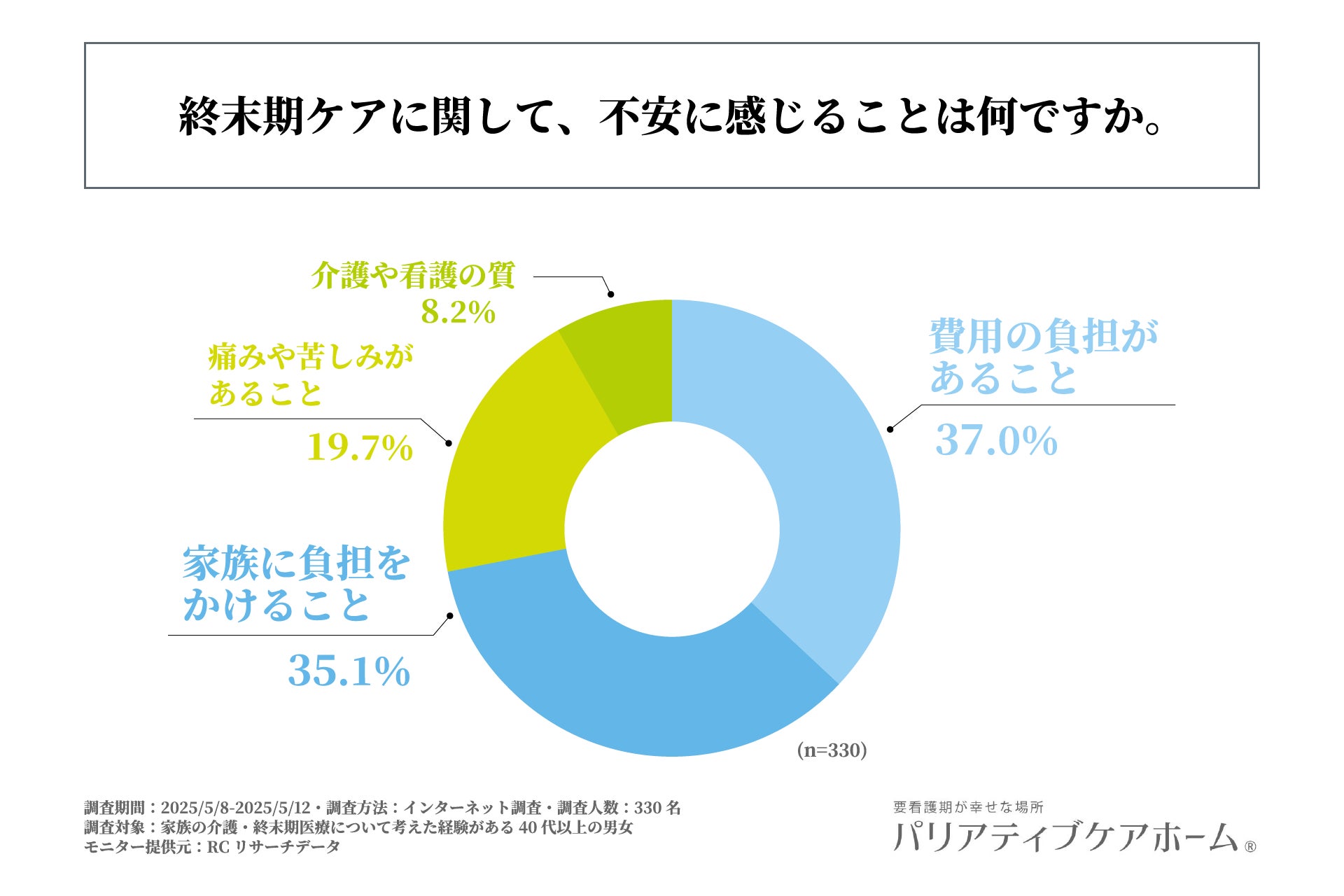 終末期ケアでは、主に「費用面の負担」と「家族に負担をかけること」を不安に感じる人が多い