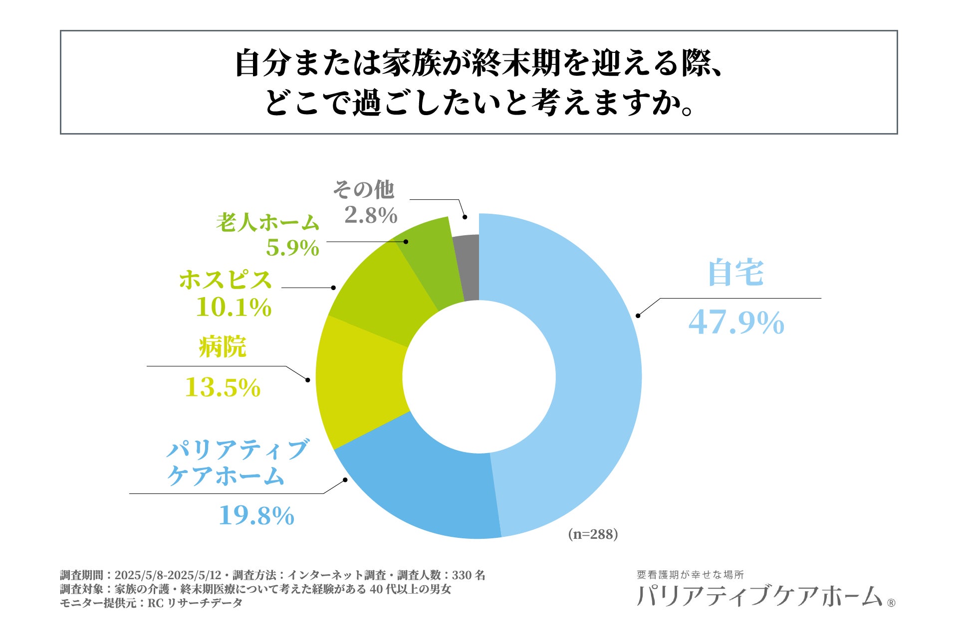 続いて、「パリアティブケア」という言葉を知らないと回答された方に「自分または家族が終末期を迎える際、どこで過ごしたいと考えるか」を尋ねる設問の回答では、1位が「自宅」で47.9%、2位が「パリアティブケアホーム」で19.8%、3位が「病院」で13.5%という結果になりました。「パリアティブケア」という言葉を知っている方の回答と比較すると、1位「自宅」2位「パリアティブケアホーム」の順位は変わらないものの、3位には「病院」が入る結果となりました。