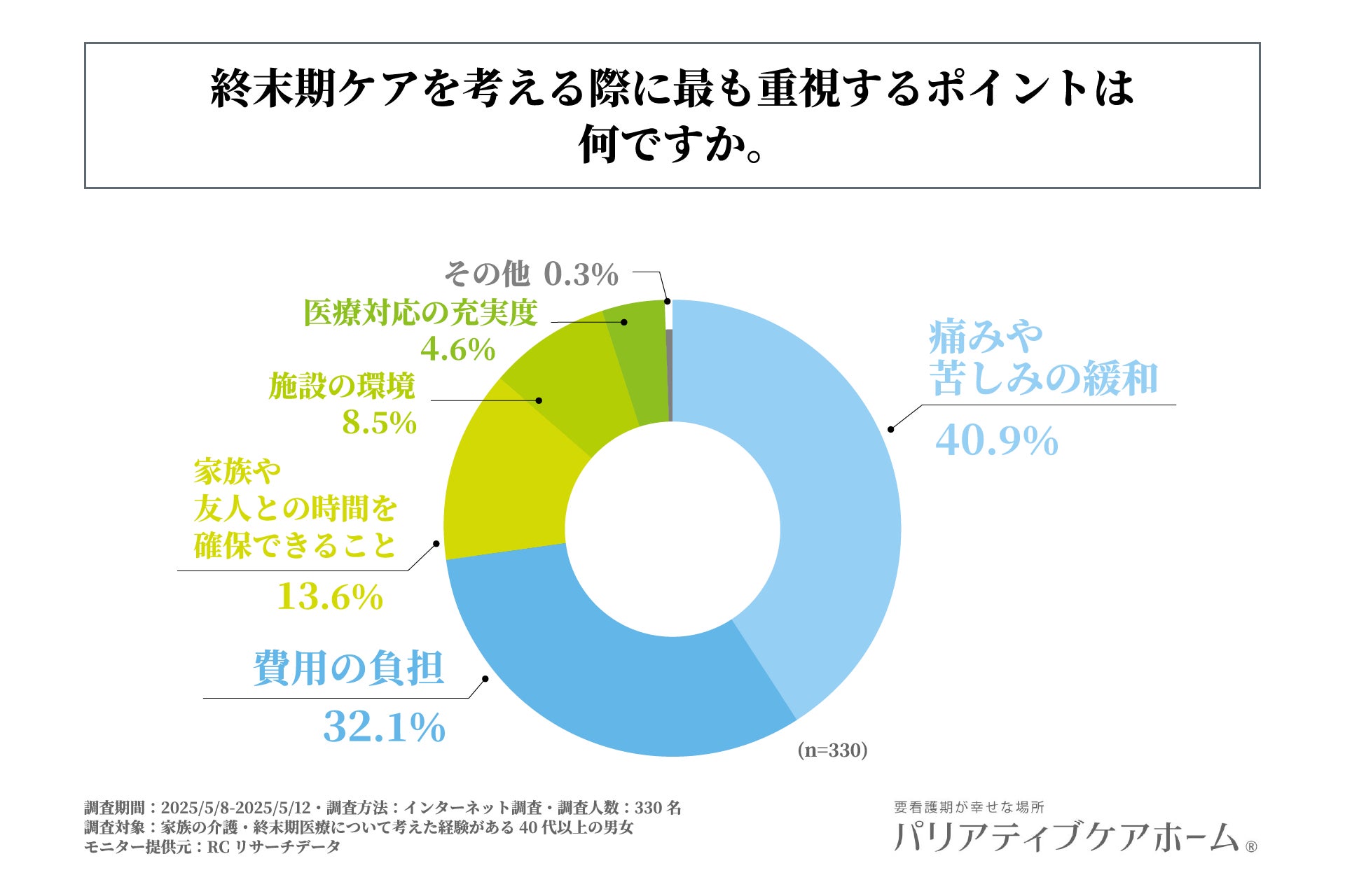 調査の最後、「終末期ケアを考える際に最も重視するポイントは何か」を尋ねる設問の回答で多かったのは、1位が「痛みや苦しみの緩和」で40.9%、2位が「費用の負担」で32.1%、3位が「家族や友人との時間を確保できること」で13.6%という結果になりました。この結果から、終末期ケアを考える際に最も重視するポイントは「痛みや苦しみの緩和」であることが明らかになりました。