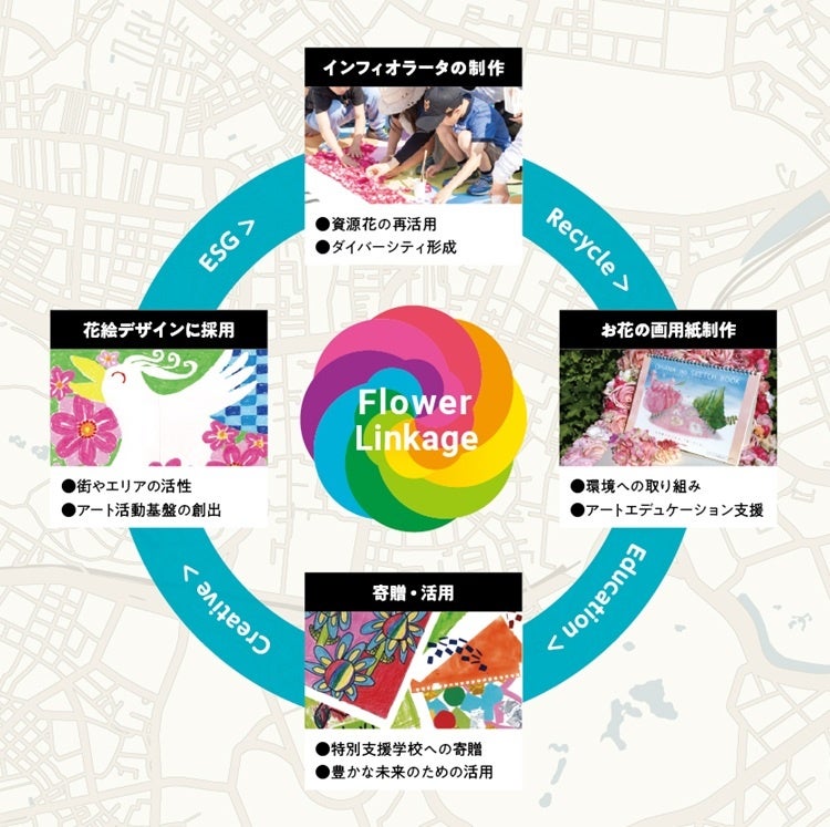 2018年よりこの活動を始め、これまでに8,960冊の「お花のスケッチブック」と、28,000枚の「お花の画用紙」を寄贈しました。そしてこの「お花の画用紙」に描かれた絵は、再び花絵として描かれ、また「お花の画用紙」として生まれ変わります。この一連のシステムを「Flower Linkage」と名付け、未来に向けて持続するサスティナブルな活動として普及に取り組んでいます。また「TOKYO FLOWER