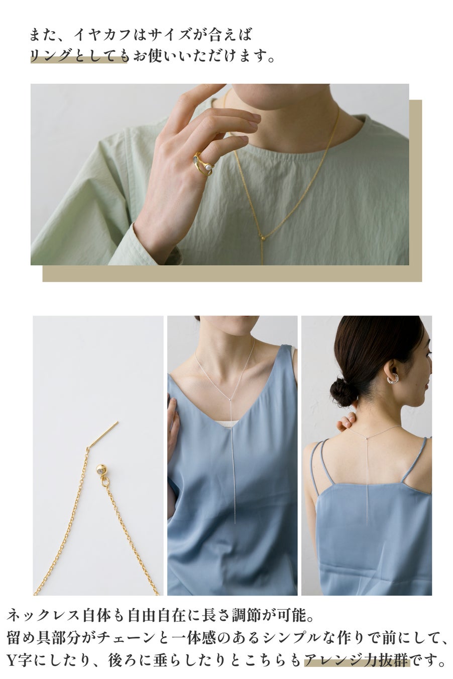 このイヤカフ&ネックレスのセットで、耳元、首元と自由自在にスタイリングができます。