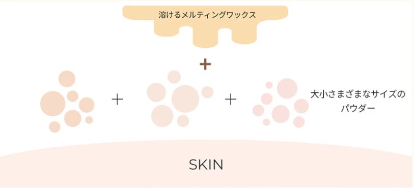 大小様々なサイズのパウダーがメルティングワックスと出会い、肌の凹凸をしっかり埋めて肌のキメをなめらかに補正します。
