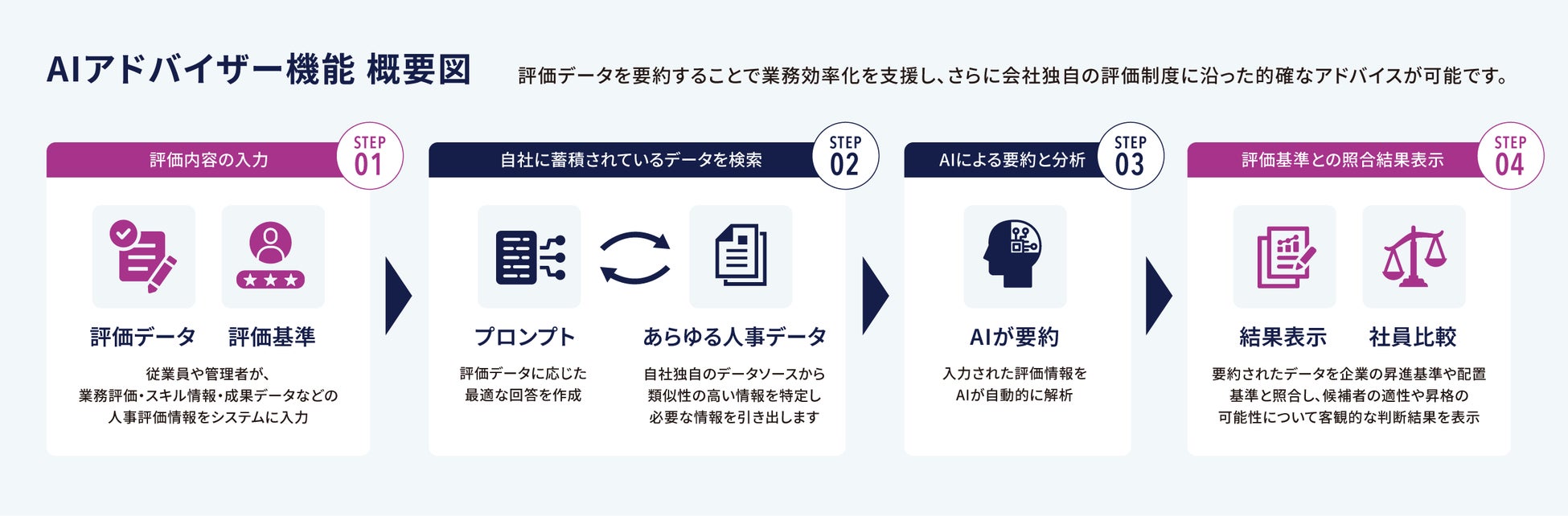本機能は、AI技術を活用することで配置転換や昇格候補者の特定など、人事戦略を練る為の的確なアドバイスをワンクリックでAIから受け取ることができる機能です。社員のスキルや成績をより精密に評価し、適切なキャリアパスの提示や従業員の教育計画などを強化することができるようになります。