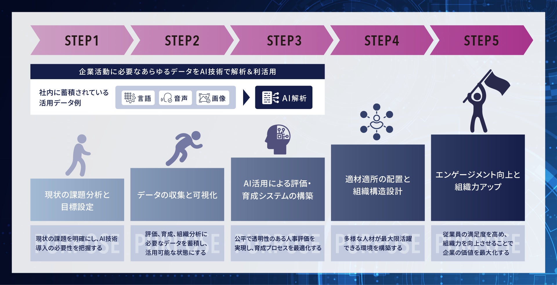 AI技術を活用しながら、企業と従業員双方にメリットをもたらす未来型人事戦略の実現をサポートします。