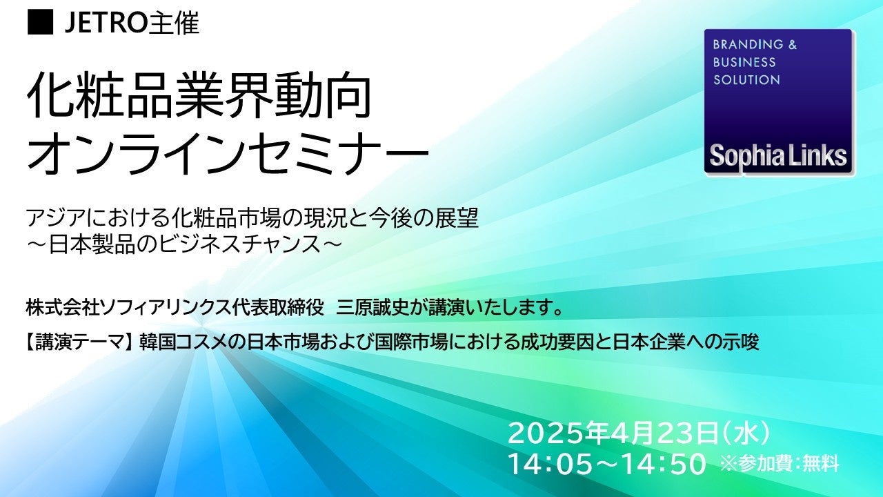 化粧品業界に専門特化したコンサルティング企業である株式会社ソフィアリンクス(本社:東京都港区、代表取締役:三原誠史)は、2025年4月23日(水)開催の日本貿易振興機構(ジェトロ)主催オンラインセミナー「化粧品ウェビナーシリーズ Day1」において、弊社代表の三原誠史が講師として登壇し、講演を行います。
