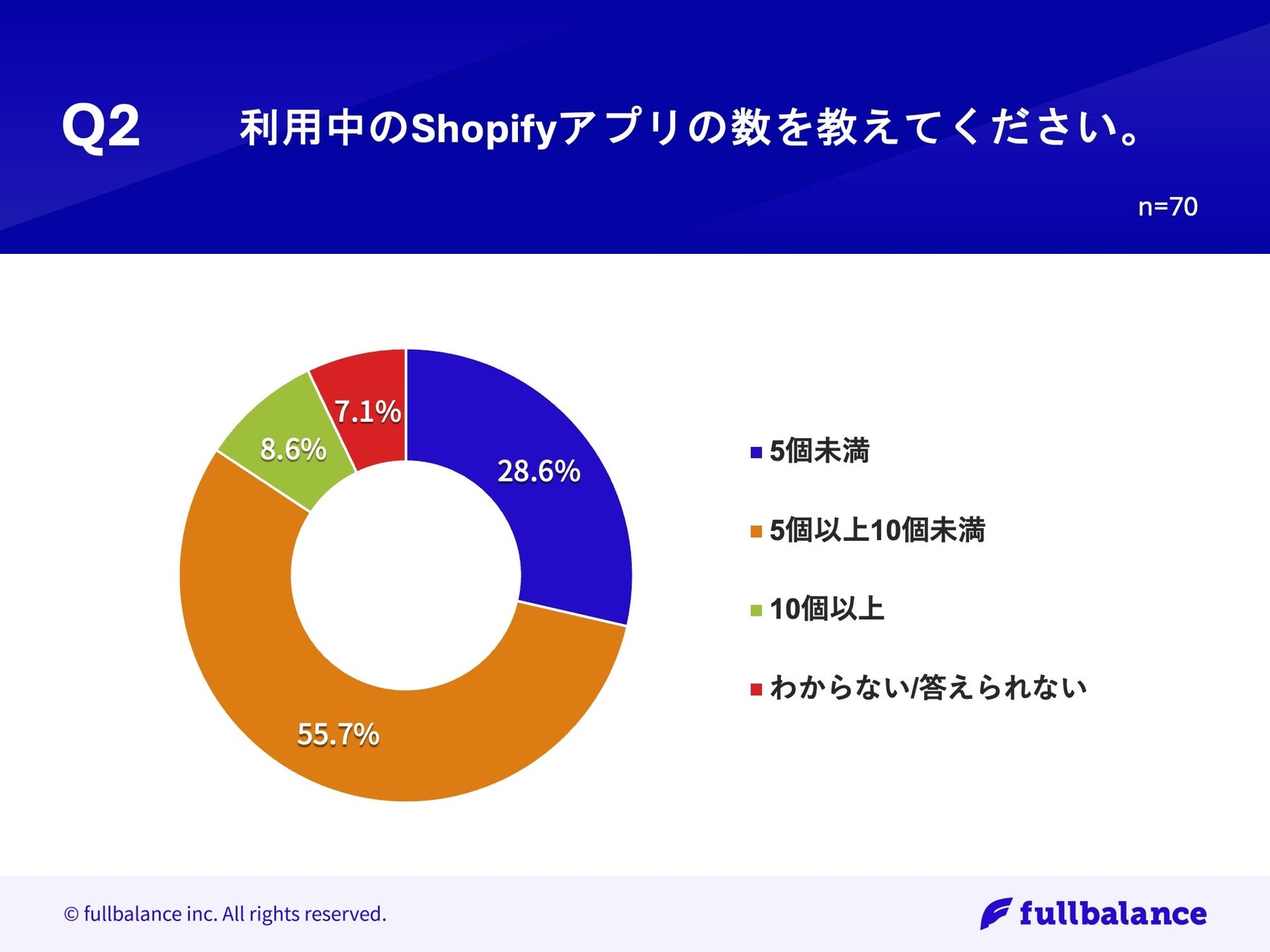 Q1で「はい」と回答した方に、「Q2.利用中のShopifyアプリの数を教えてください。」(n=70)と質問したところ、「5個以上10個未満」が55.7%、「10個以上」が8.6%という回答となりました。