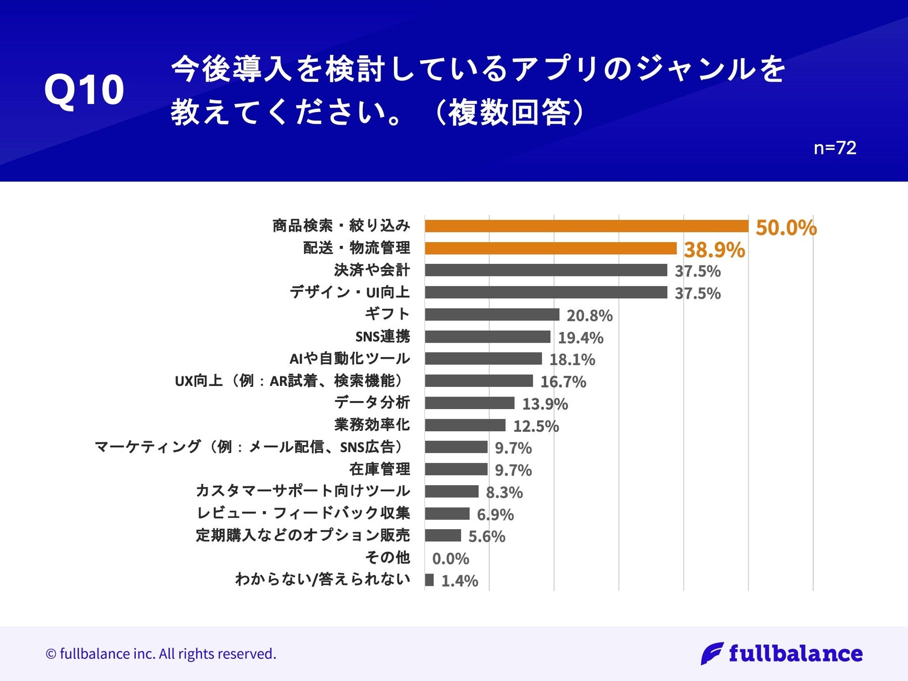 Q9で「導入予定が決まっている」「導入を検討している」と回答した方に、「Q10.今後導入を検討しているアプリのジャンルを教えてください。(複数回答)」(n=72)と質問したところ、「商品検索・絞り込み」が50.0%、「配送・物流管理」が38.9%という回答となりました。