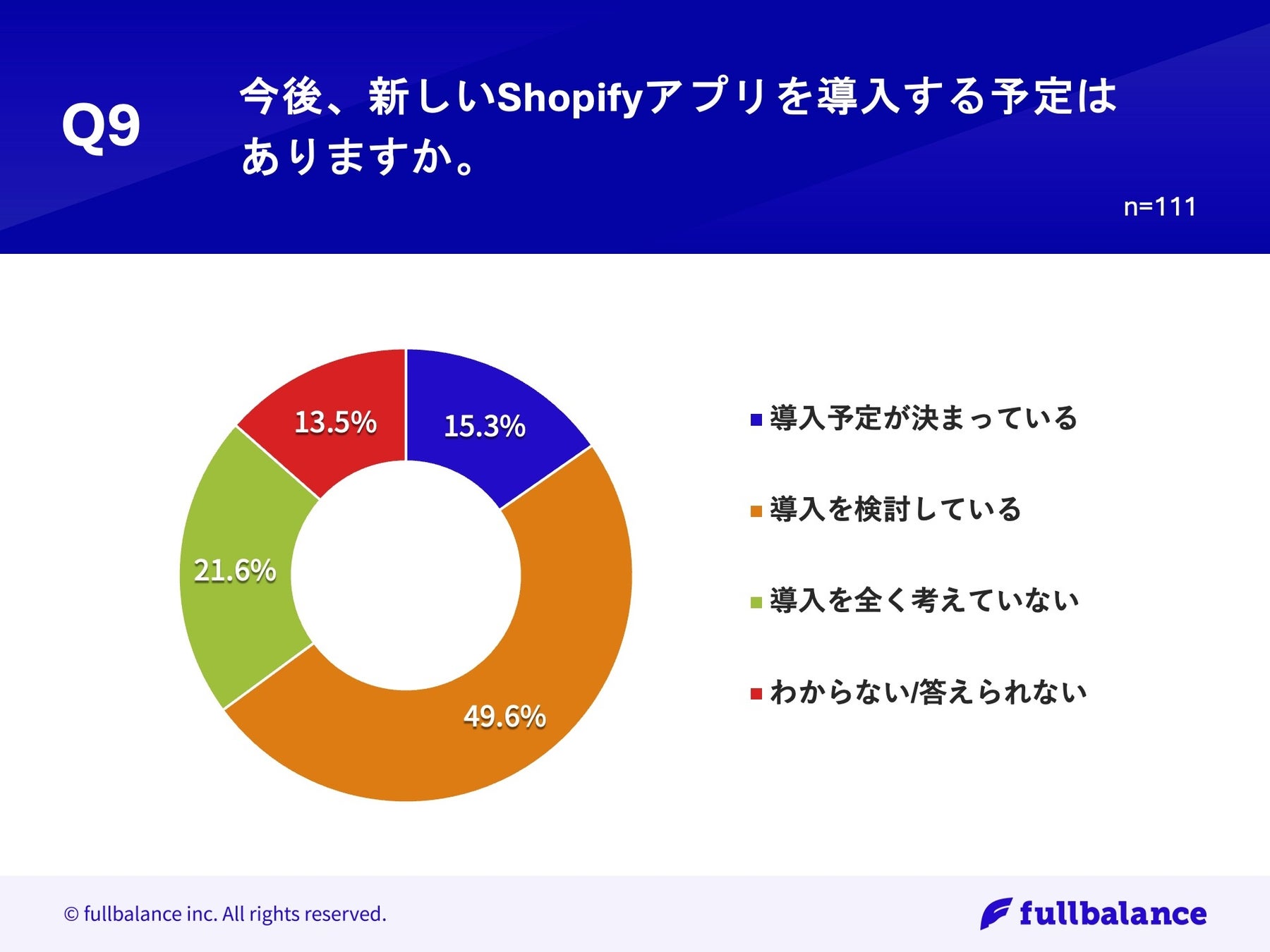 「Q9.今後、新しいShopifyアプリを導入する予定はありますか。」(n=111)と質問したところ、「導入予定が決まっている」が15.3%、「導入を検討している」が49.6%という回答となりました。