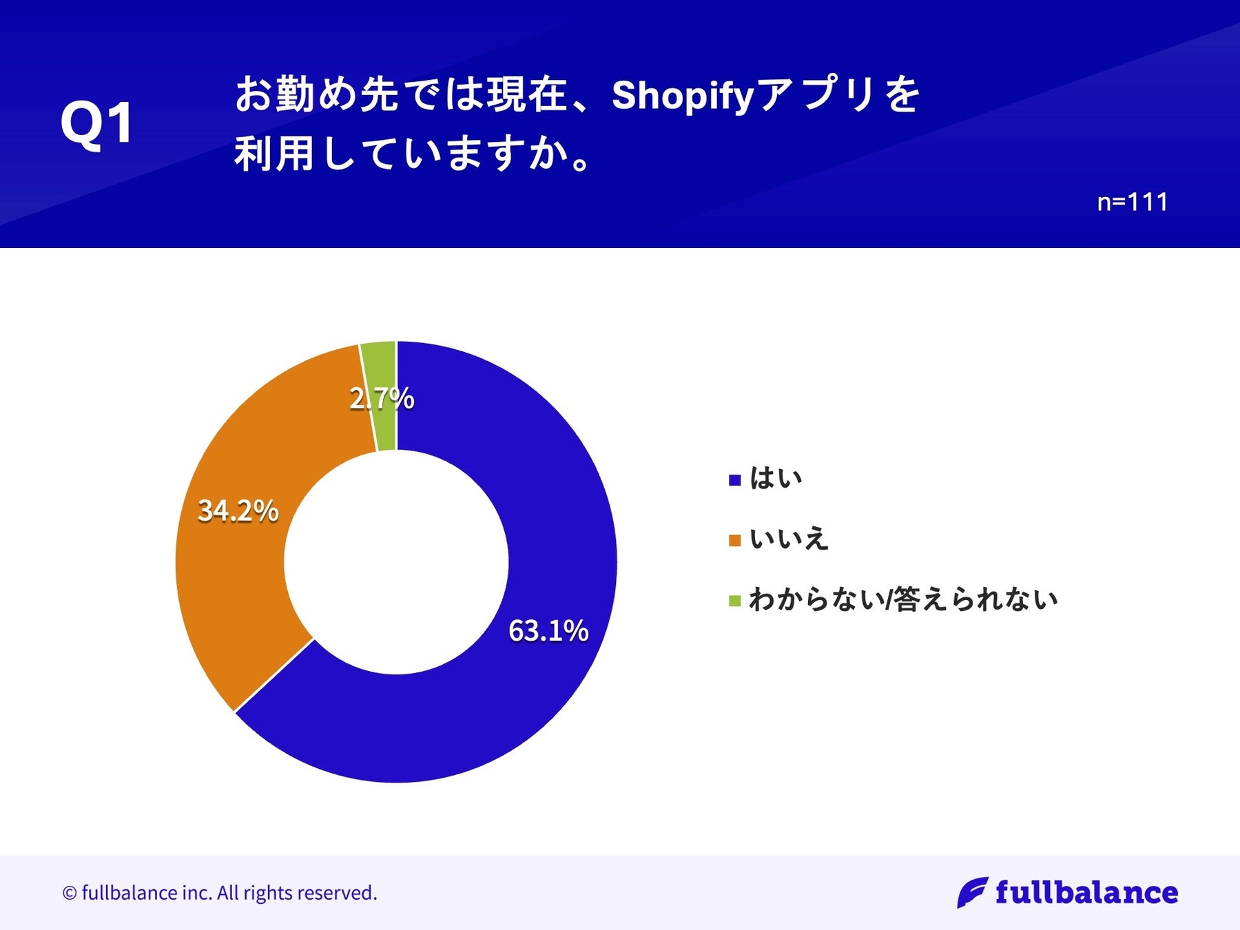 「Q1.お勤め先では現在、Shopifyアプリを利用していますか。」(n=111)と質問したところ、「はい」が63.1%、「いいえ」が34.2%という回答となりました。