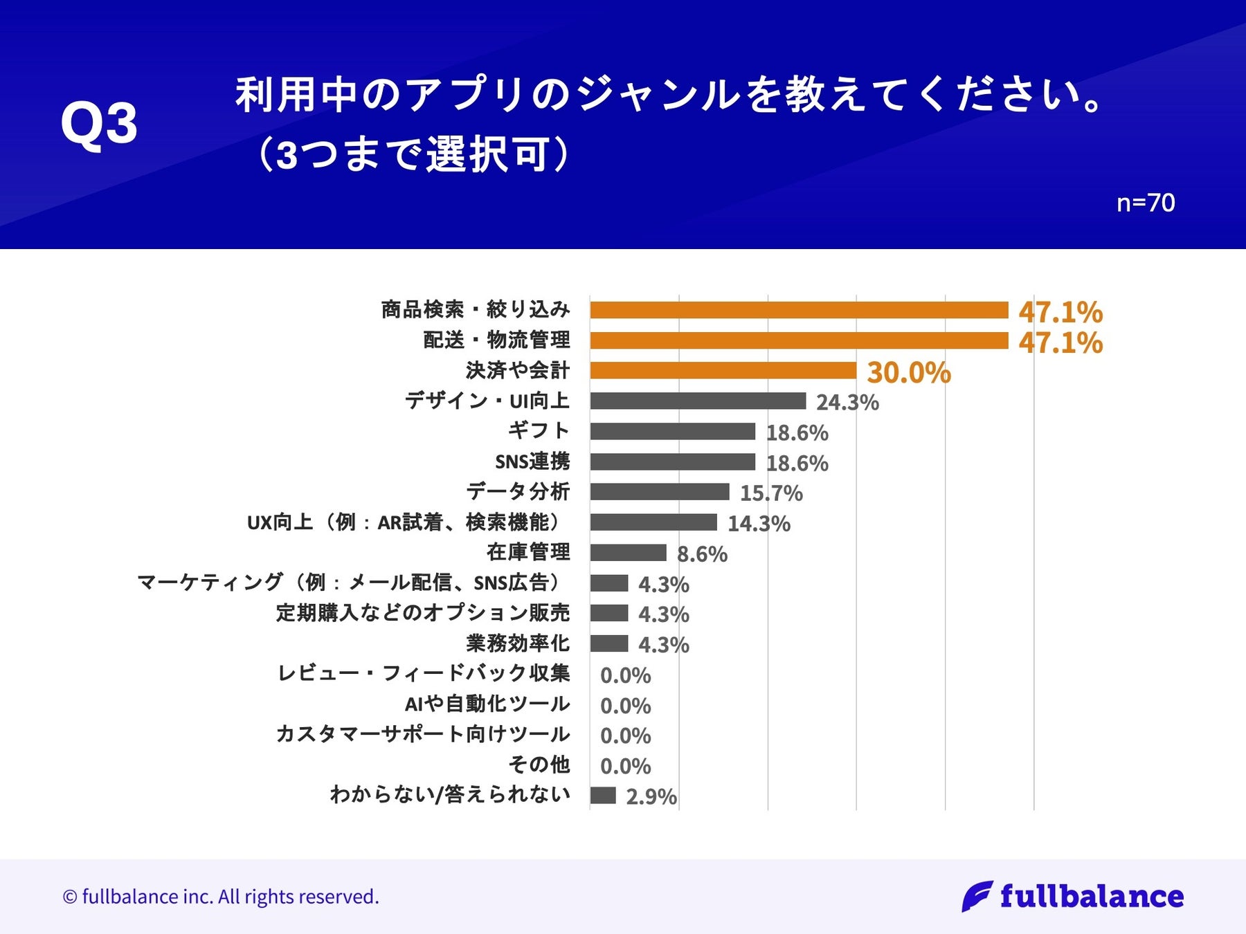 Q1で「はい」と回答した方に、「Q3.利用中のアプリのジャンルを教えてください。(3つまで選択可)」(n=70)と質問したところ、「商品検索・絞り込み」が47.1%、「配送・物流管理」が47.1%、「決済や会計」が30.0%という回答となりました。