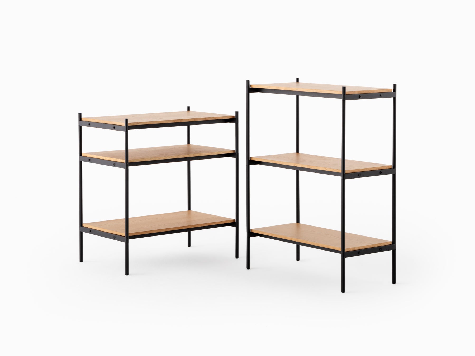長く使っていただけるよう、傷が目立ちにくい粉体塗装を施した丈夫なスチールを採用。棚板にはナチュラルな風合いを持つ天然木の突板を使用し、耐水性に優れたラッカー塗装を施しました。