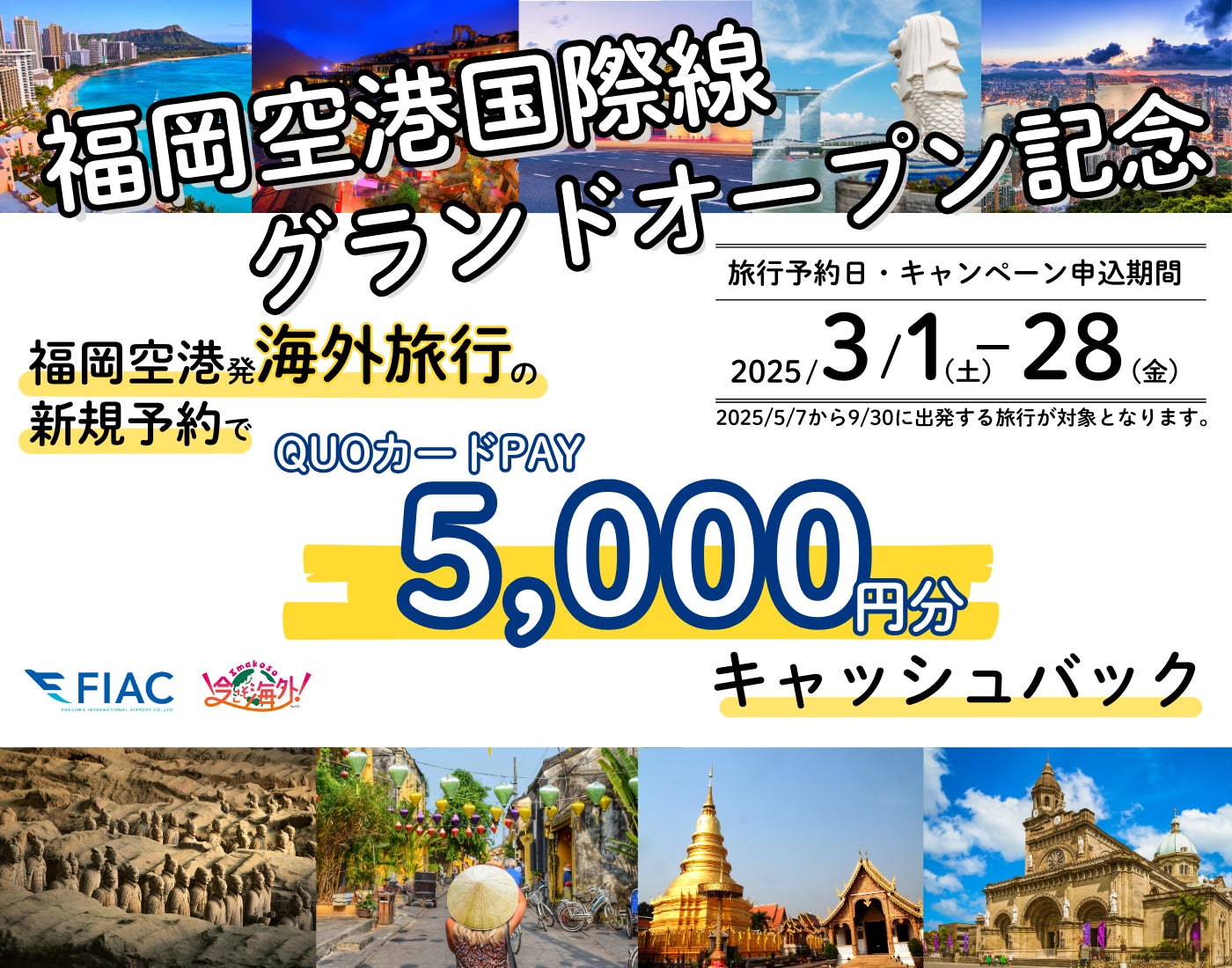 福岡空港国際線ターミナルビルのグランドオープンを記念し、QUOカードPay 5,000円キャッシュバックキャンペーンを実施します。