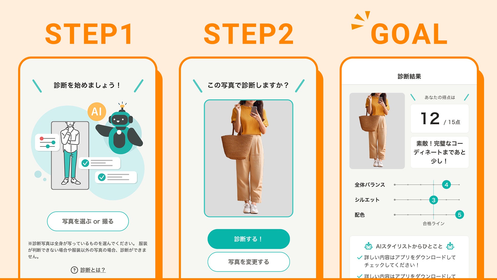 診断機能は、ユーザーが投稿した全身の服装画像をAIで診断し、採点を行う機能です。これにより、ユーザーは客観的な評価を受けることができます。