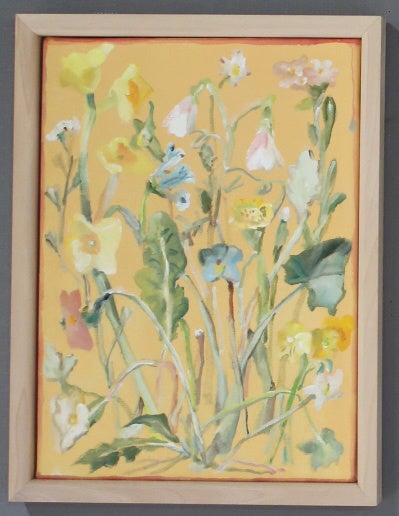 庄島歩音は、日々の暮らしの中にささやかに存在する植物や動物、そしてふと目にとまるような風景へのまなざしを通して、それらの形に潜む記憶や感情をすくいあげるようにして作品が描いています。彼女の制作の根底には、フォークアートに通じる手しごとの感性や、作品と静かに対話するような姿勢が滲んでいます。その上で、装飾的なリズムと繊細な間合いを意識した構成力、そして現代的な詩情をあわせ持ち、静けさと物語性を同時に湛えた独自の世界を生み出しています。また色彩や形の軽やかな遊び心と同時に、どこか祈りに近いような静謐さが漂っており、観る者を優しく包み込むような柔らかさがあります。それはまるで、記憶の片隅にずっと佇んでいた何かが、静かに輪郭を取り戻してゆくような感覚に近いかもしれません。そしてその一方で、作品のある一点に視線を留めたとき、不意に心の奥の深層に触れるような、ひやりとした鋭さや透明な強さを感じさせる瞬間が訪れます。庄島の絵画は、装飾性と叙情性、柔らかさと強さ、内省と開放といった相反する要素が、見えない糸で美しく調和しているのです。