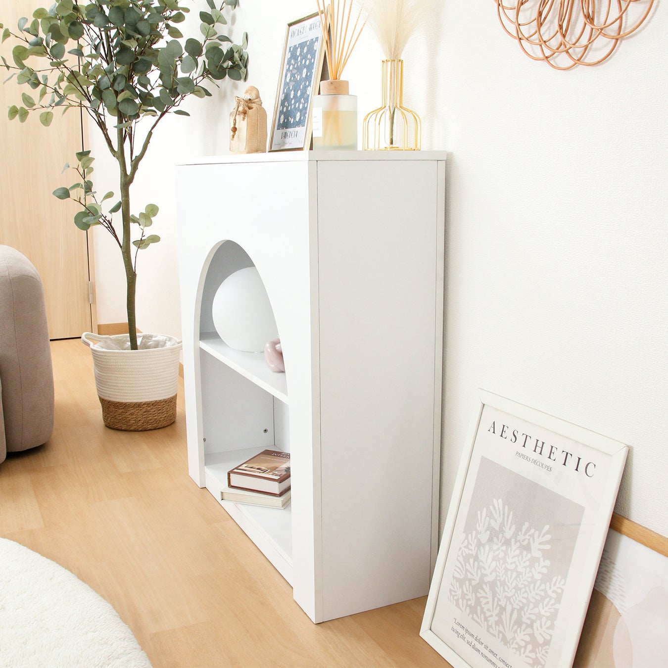 棚の上段サイドにはコード穴がついているので、スタンドライトなどのコードもスッキリ。正面からは穴が見えないところもポイントです◎