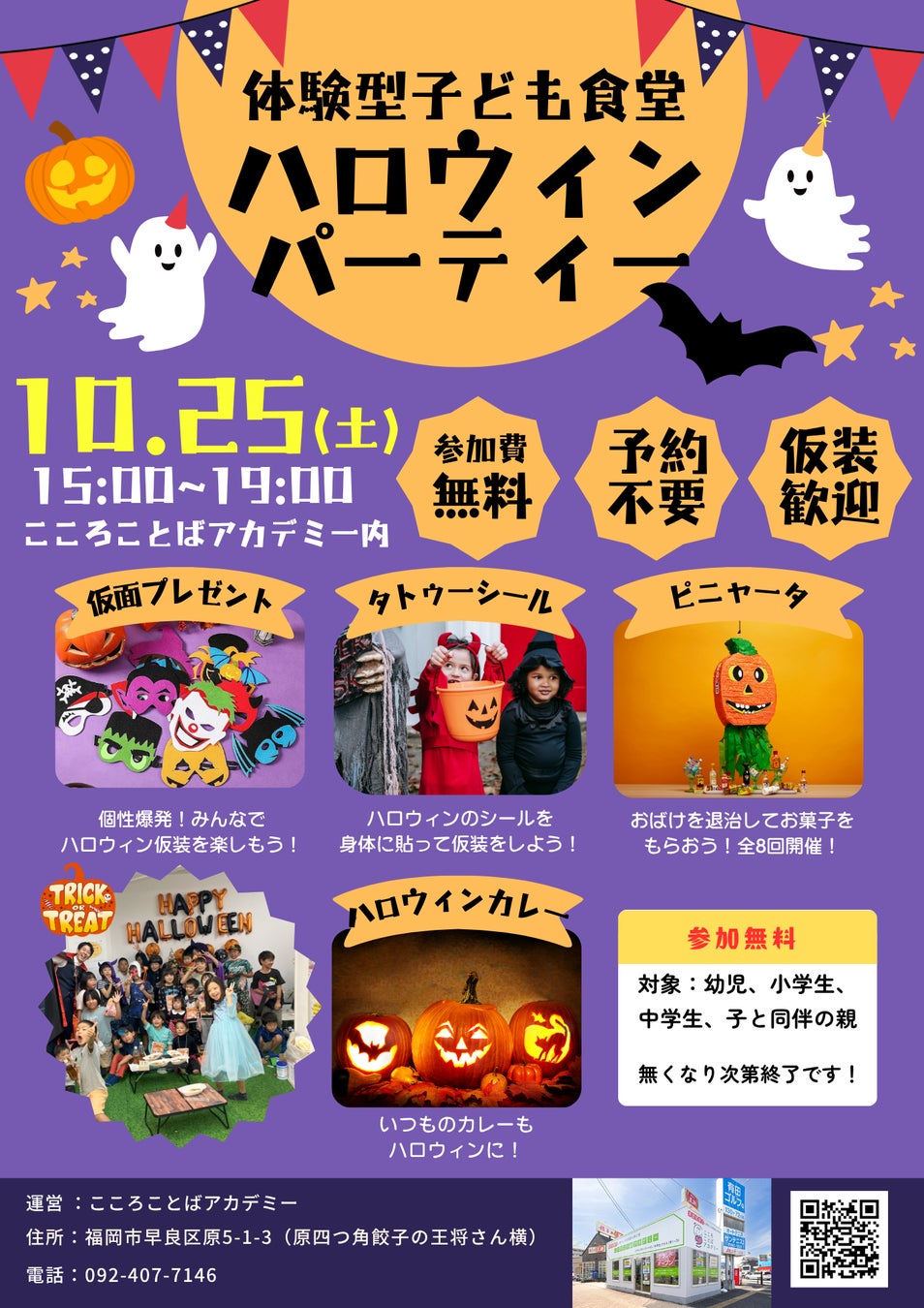体験型子ども食堂を運営する「株式会社こころことばアカデミー」は、2025年10月25日(土)15:00から、子どもたちとそのご家族を対象とした【体験型子ども食堂 ハロウィンパーティ】を開催します。