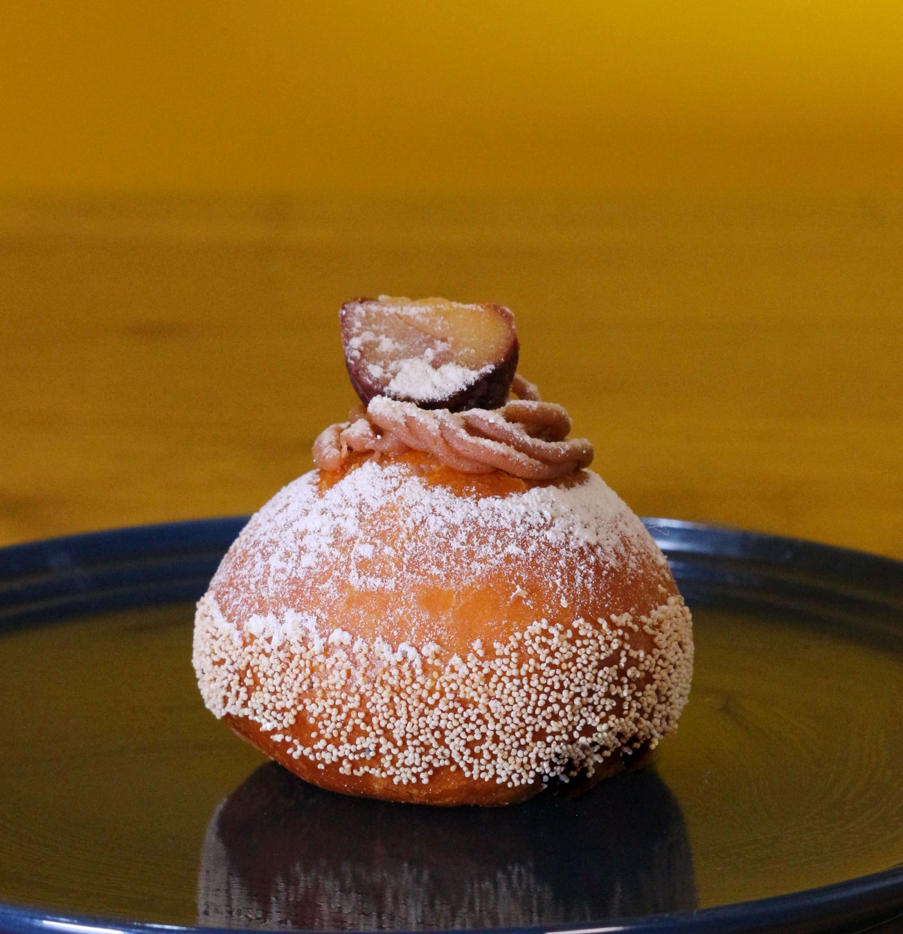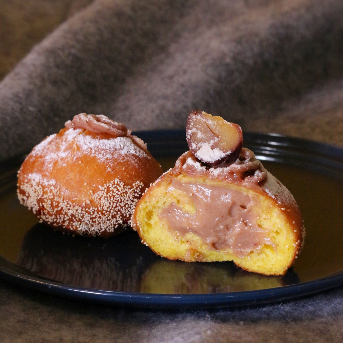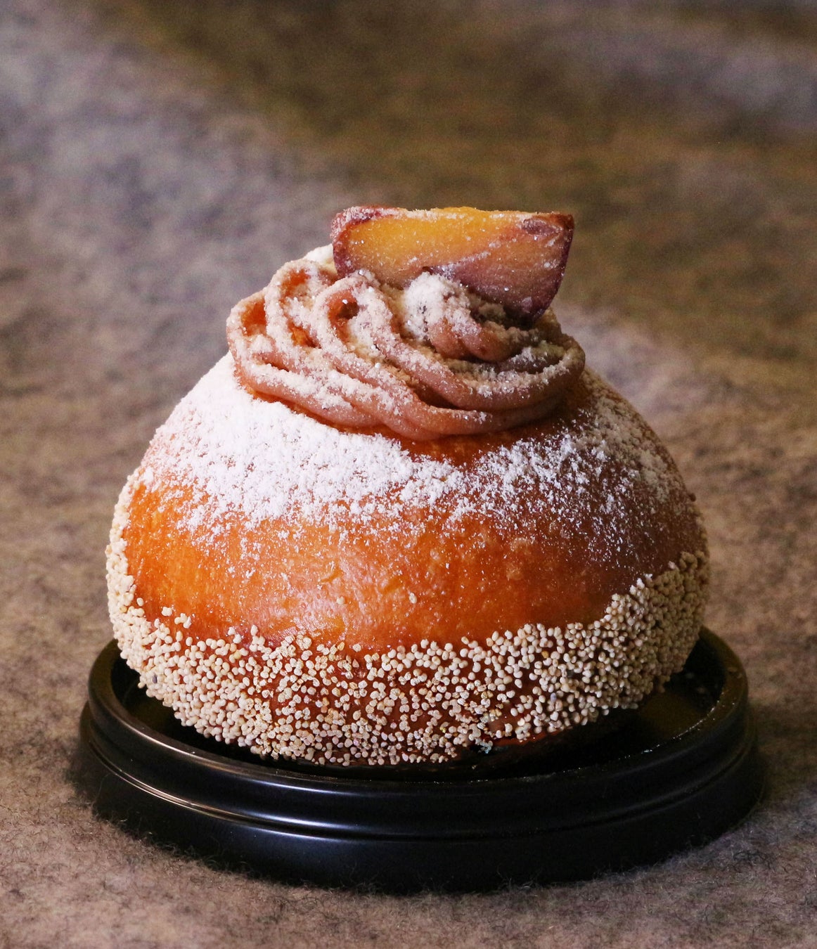 商品を手に取ると、まず、ずっしりとしたその重みに驚きます。じっくり揚げた丸いドーナツに栗の渋皮煮をトッピング、そして表面には粉糖とケシの実をまぶしています。
