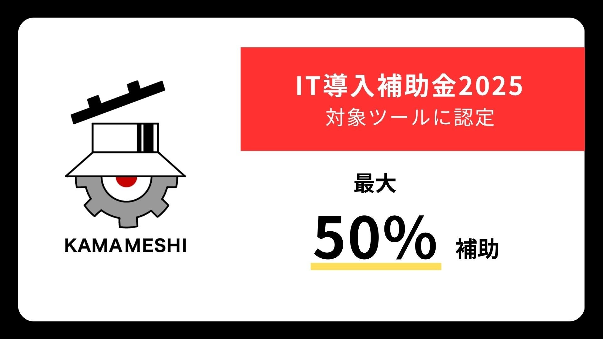 日本製鉄発のスタートアップ株式会社KAMAMESHI(本社:東京都大田区、代表取締役:小林 俊)は、経済産業省が実施する「IT導入補助金2025(以下、IT導入補助金)」の支援対象ITツールとして認定されました。これにより、導入費用の最大50%が補助されます。