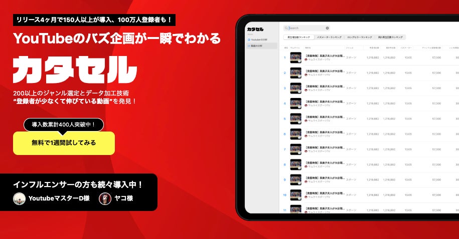 リリース4ヶ月で200社以上が導入!YouTube企画リサーチツール『カタセル』〜伸びる企画をデータで発掘!戦略的なチャンネル運営を実現〜