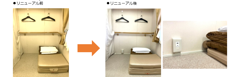 かねてよりご要望の多かった脱衣所のコインロッカーを100円リターン式からコイン不要の無料タイプとし、温かみのある色へ交換しました。またロッカーの他に棚を新設し、床面は落ち着いた色合いのものに新調しました。また、トイレ床面も木目調のものに貼り換え、全体的に清潔感や落ち着きのある仕様としました。