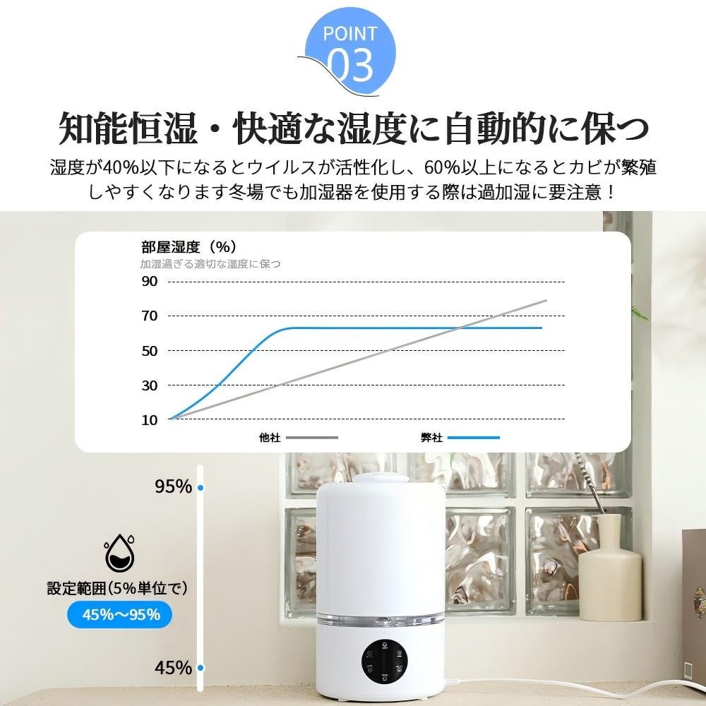加湿器を使用する上で大切なのは、部屋が過加湿にならないこと。このMUH-NW045はミスト量を3段階で調節でき、湿度は**45%~95%**の範囲で自由に設定可能です。部屋の広さやお好みに合わせて、加湿量を最適に調整できます。