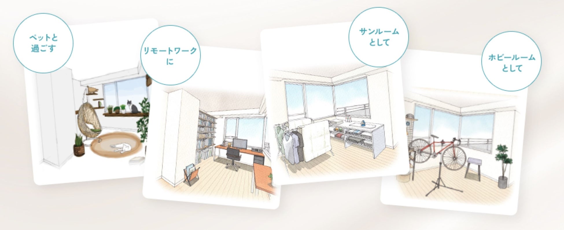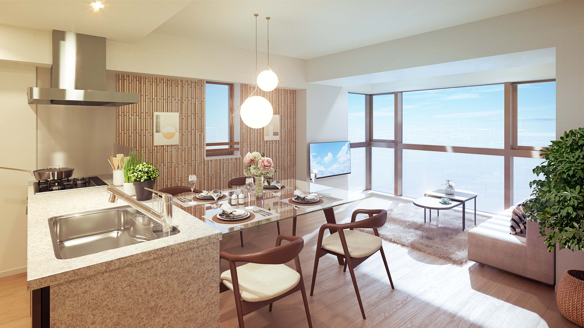 フージャース30周年記念プロジェクトとして、ユーザーの声から生まれたオリジナル商品企画の洗濯の時短・効率化ができる「Arauラック」、天井から床までガラス張りの「Soraリビ」、バルコニーを活用したプラスαの自由空間「Re:Room」、シンクとコンロを分離したⅡ列型のアイランドキッチン「fitキッチン」などを多彩に備えていることも特徴です。また、敷地内には各所に散歩道やベンチ、テラス付きのラウンジやどんぐり拾いのできる広場など住戸以外の憩いの場所を設計しました。