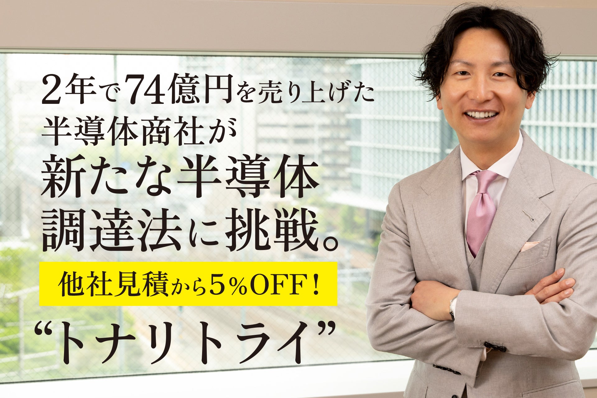 トナリズム株式会社(代表取締役・新川裕也、神奈川県川崎市)は2024年6月下旬、半導体・電子部品のお得な調達をサポートするサービス「トナリトライ」(https://tonaritry.jp/)を始めました。他社の見積もりを提示していただくことで、その価格から5%割引で調達・販売いたします。当社はコロナ禍の深刻な半導体不足の中でも、独自のノウハウや仕入れルートにより、2年間で74億円の売り上げを達成しました。調達力に絶対の自信がある当社だからこそ提供できるサービスです。
