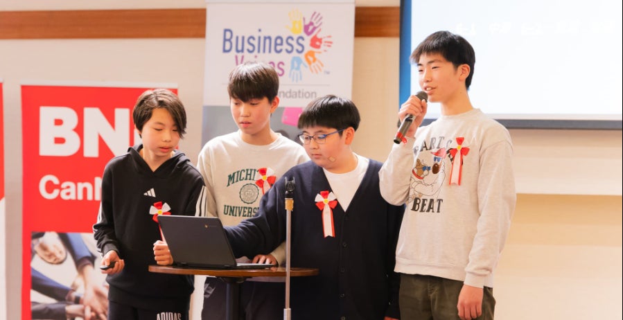 校内選抜を勝ち抜いた優勝チームは、2026年2月、現役経営者たちが集うビジネスミーティング「BBM(Big Business Meeting)」に登壇。少子高齢化に伴う2030年の人手不足問題に切り込む会社の事業案を堂々とプレゼンし、大人たちから大きな喝采を浴びました。