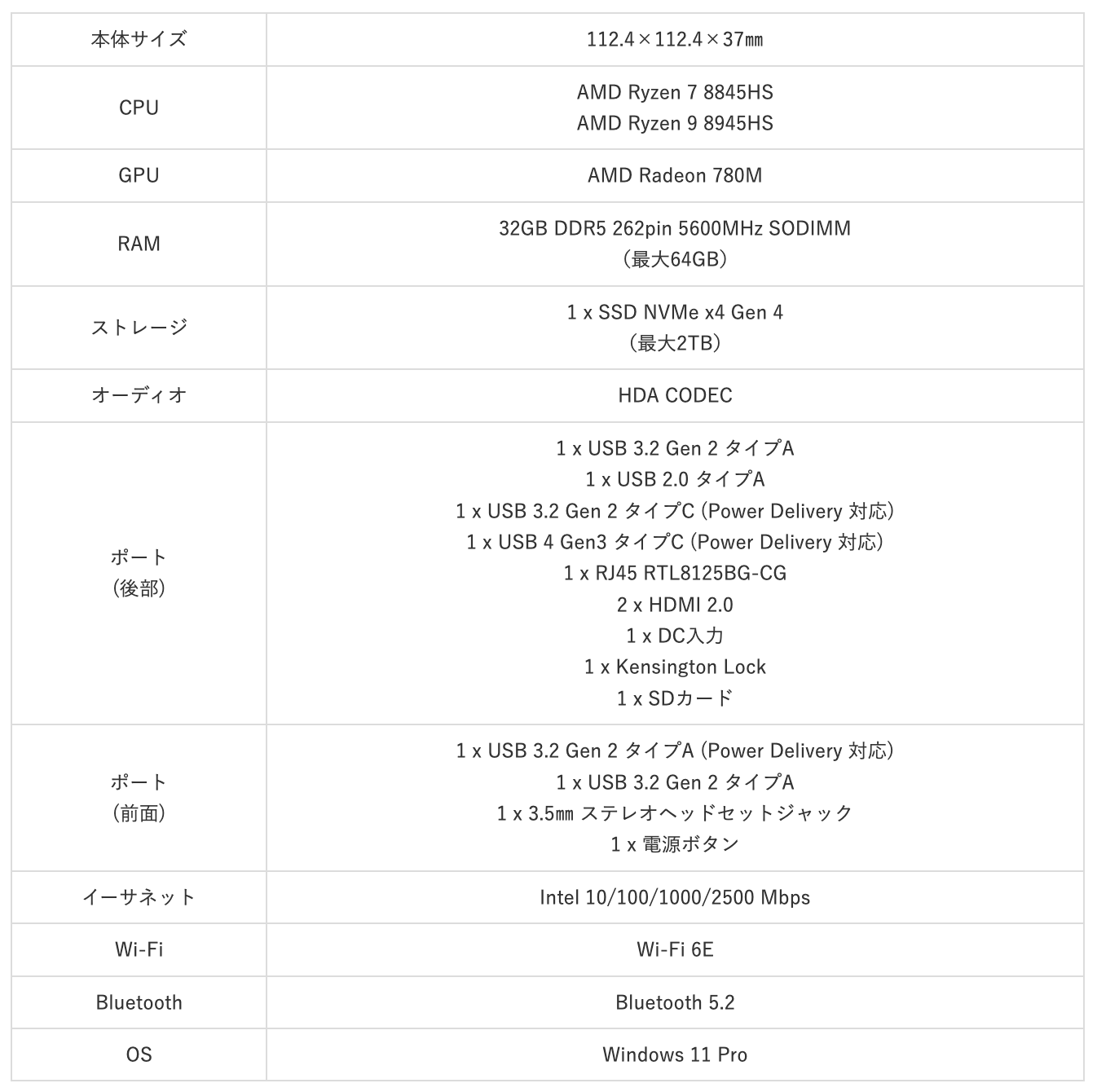気になる点はあるものの、場所を取らずにどこでも設置することができる手の平サイズのコンパクトな筐体に最新のSoCや32GB RAM、1TB/2TBストレージを搭載し、デザイン面も他のミニPCより高級感があり、価格もセールなどを利用すれば10万円以下で購入出来るなど、コストパフォーマンスにも優れており、性能・コスト・デザインの3つが揃ったミニPCなので、そういったミニPCを求めているユーザーには選択肢の1つとして候補に入れても良いモデルだと思う。