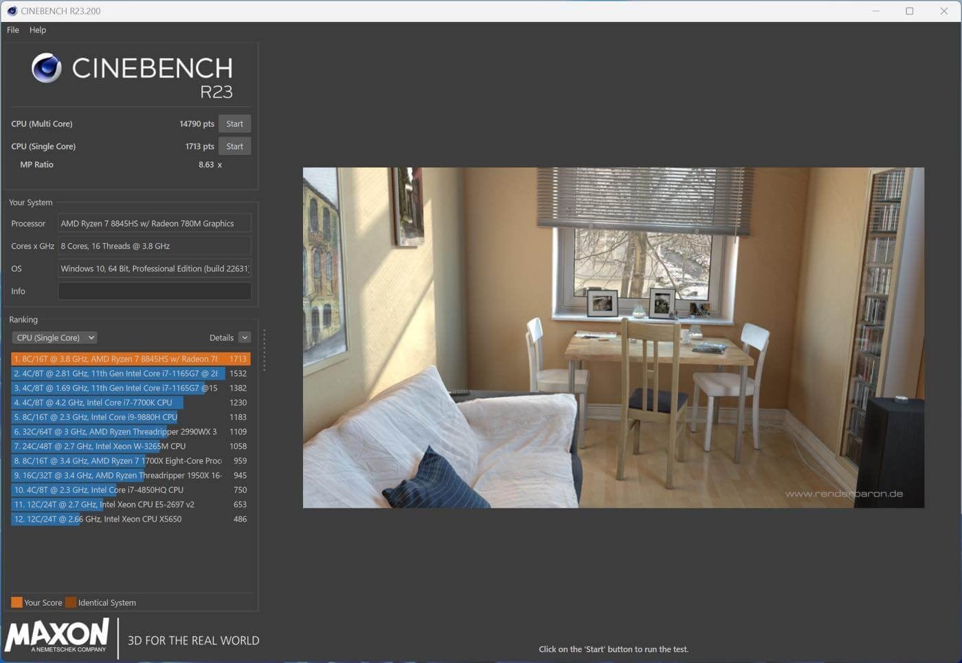 「CINEBENCH R23」はCGレンダリング速度からCPU性能を測定するベンチマークで、CGレンダリングはマルチスレッド処理向きの作業であることからコア/スレッド数が多ければ多いほど性能が高くなる他、動作周波数に比例して性能が上がる傾向もあり、CPUの最大性能を比較するのに最適なベンチマーク。