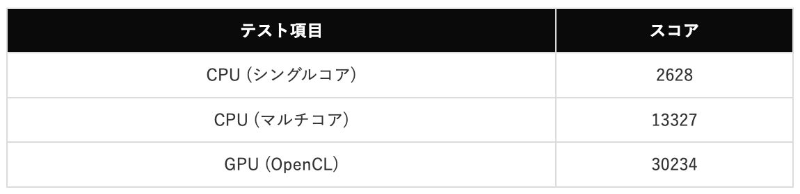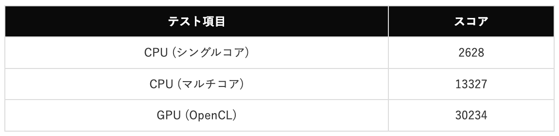 GeekBenchのベンチマークはプロセッサごとのランキングが公開されており、他のプロセッサとのスコアの差など、ランキングの詳細はこちらをご覧下さい。また、OpenCLのスコアのランキングはこちら。