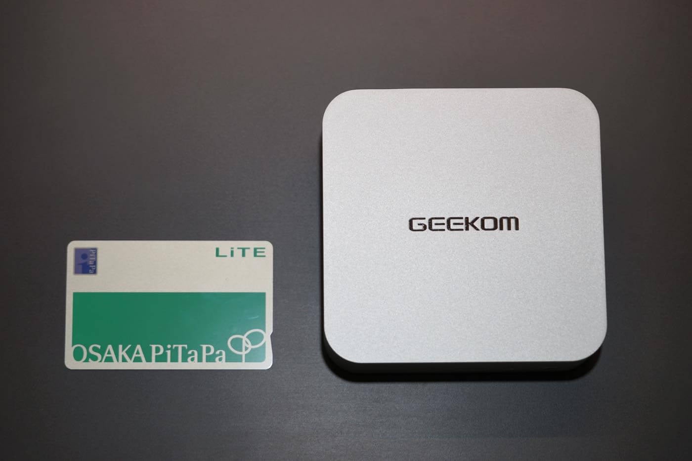 下記は「GEEKOM A8」の実際の大きさが分かり易いよう、「iPhone 15 Pro」や「ICカード(PiTaPa)」と比較してみたもので、その小ささが良く分かります。