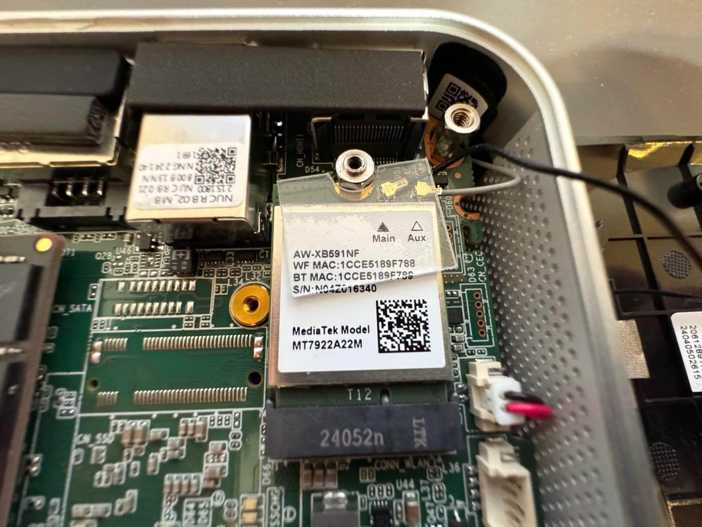 Wi-Fi/BluetoothモジュールはSSDの下に搭載されており、Azurewaveの「AW-XB591NF」(中身はMediaTek MT7922A22M)が搭載されています。Wi-Fi 6EとBluetooth 5.2に対応。