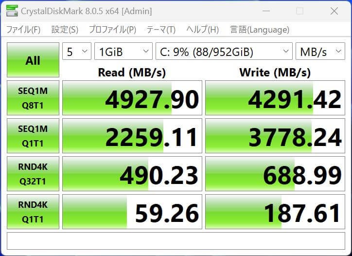 シーケンシャルリードが約4900MB/s、シーケンシャルライトが約4300MB/sといった結果で、NVMe x4 Gen 4の理論値(最大8GB/s)には及ばないものの、通常の使用であれば特に問題ない速度。