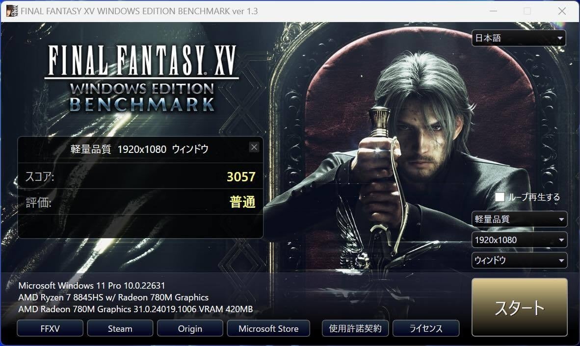 2018年に発売された重量級のアクションRPG「Final Fantasy XV」のPC版が快適に動作するか否かを推し量るためのベンチマーク。内蔵GPUなので「軽量品質 / 1920×1080 ウインドウ」といった設定でようやく動くといった感じ。標準品質だとベンチマーク中も動作がカクカクすることも多々あり。