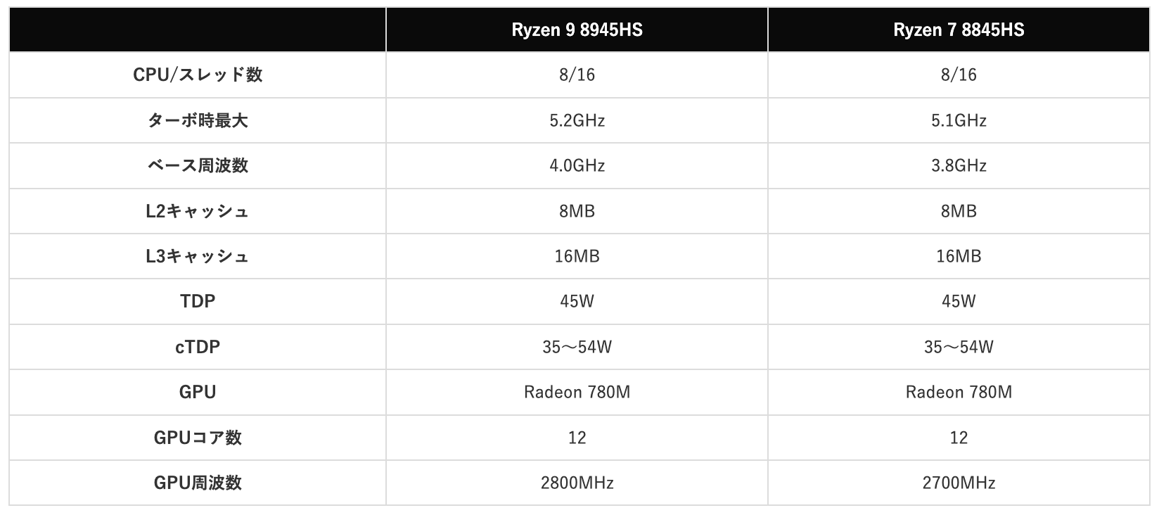 「GEEKOM A8」は上述した通り、AMDの最新世代のSoC「Ryzen 8040」シリーズ(開発コードネーム:Hawk Point)の最上位モデルである「Ryzen 9 8945HS」と「Ryzen 7 8845HS」を搭載しています。どちらも8コア/16スレッドのCPUと内蔵GPUとして「Radeon 780M」を搭載しており、違いはCPUとGPUの動作周波数で、「Ryzen 7 8845HS」はCPUのベース周波数が3.8GHz、ターボ時最大が5.1GHzとなっているのに対し、「Ryzen 9 8945HS」はベース周波数は4.0GHz、ターボ時最大は5.2GHzと少し引き上げられており、「Radeon 780M」の動作周波数も2700MHzと2800MHzで100MHzの差があります。