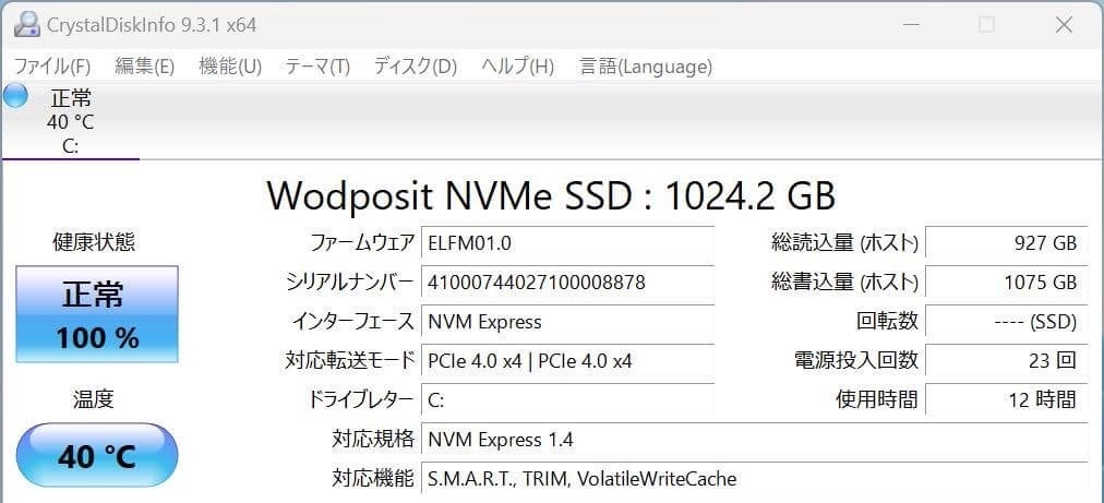 (▲「CrystalDiskInfo 9.3.1」で読み取ったSSDの情報。)