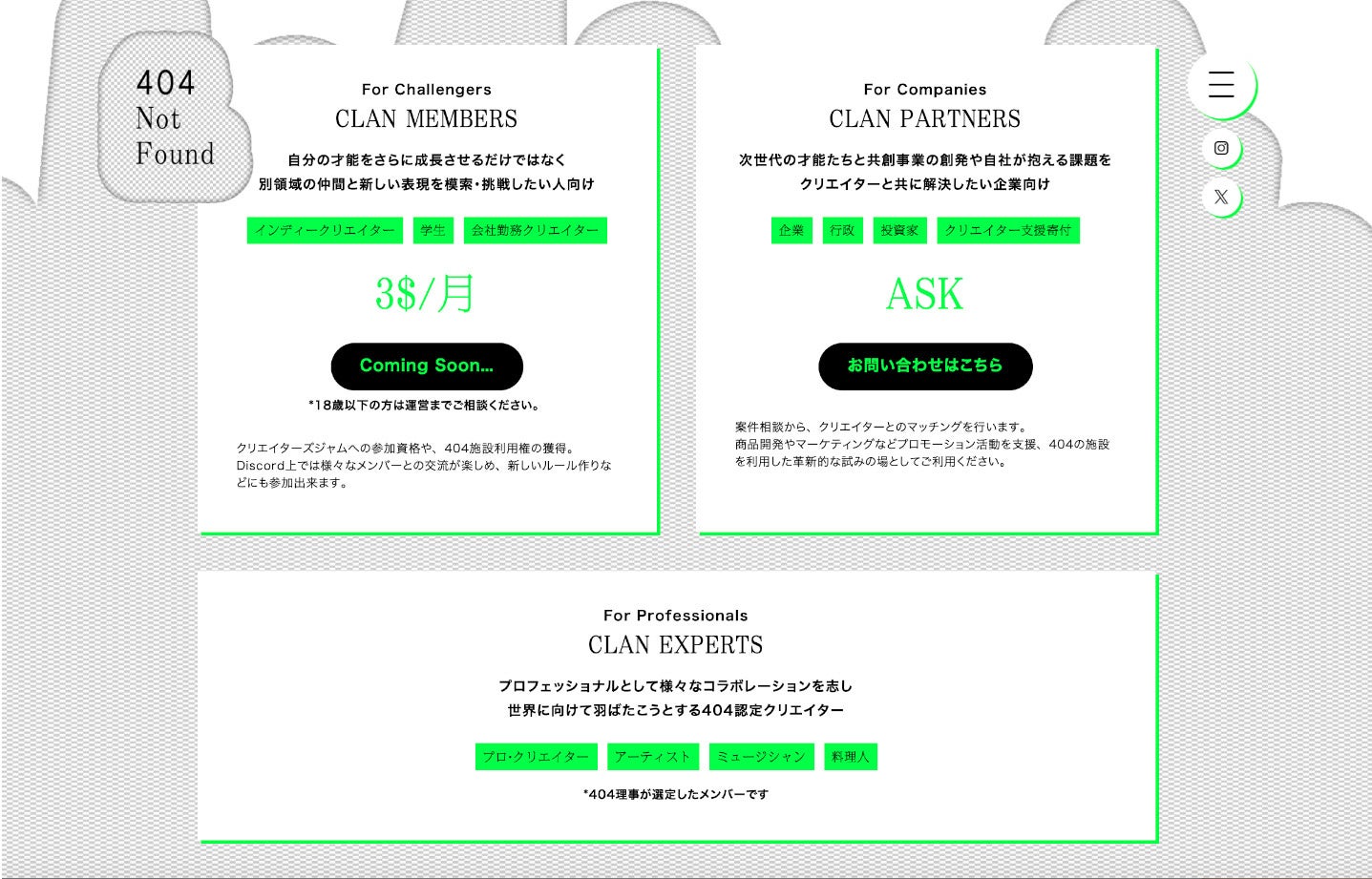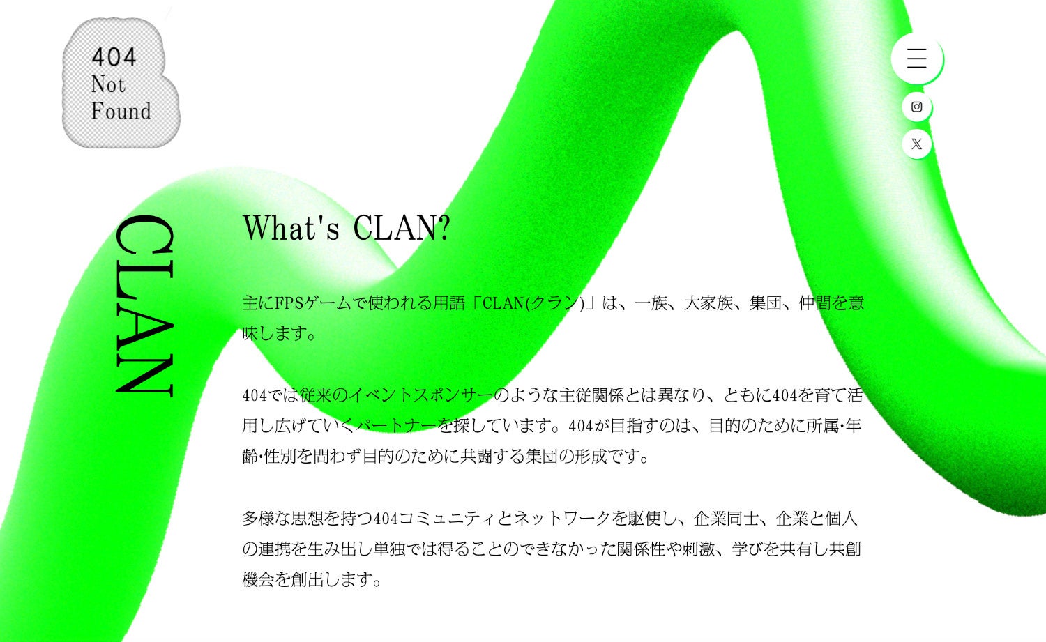 ビデオゲームの世界では、一緒にプレイする仲間を「CLAN(クラン 英語で部族や一門を意味する言葉)」と呼び、そのつながりを表現しますが、404 Not Found では、一緒になってクリエイション拠点を盛り上げていくクリエイターを募集し、施設およびオンライン上のつながりから、様々なジャンルでの共創はもちろん、ジャンルを横断したコラボレーションを実現していきます。