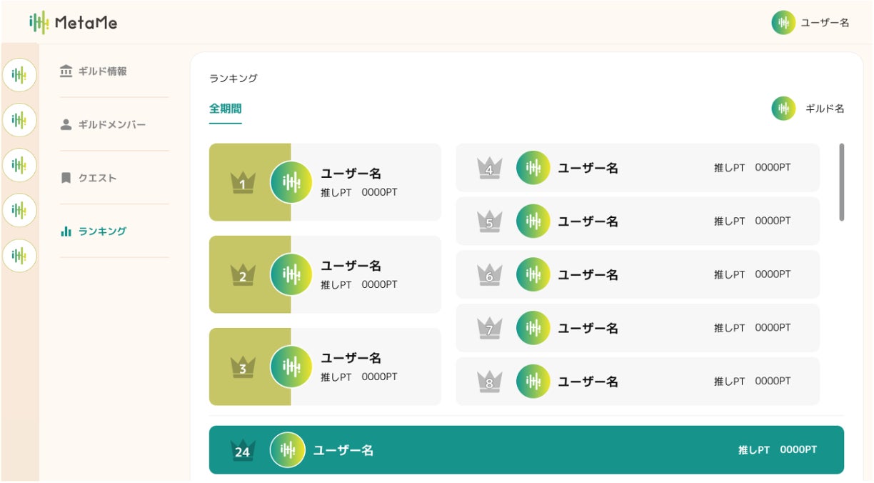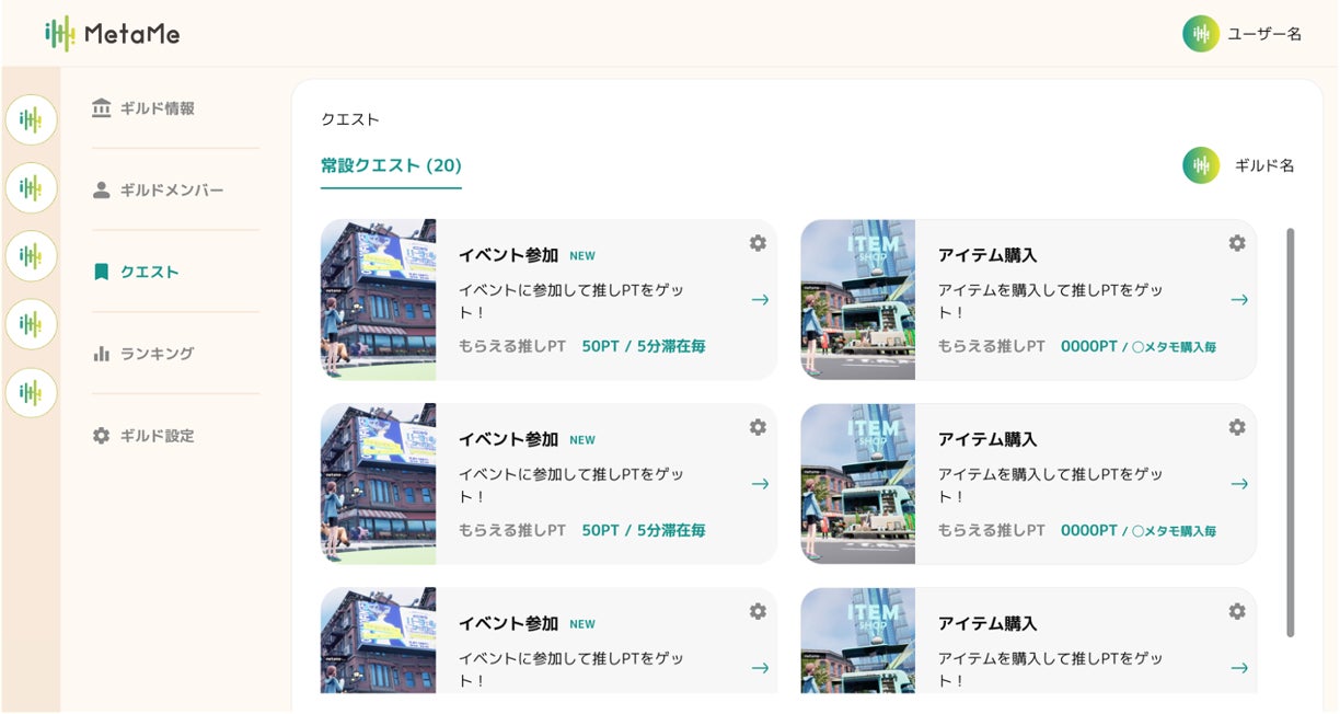 MetaMeでは「わたしらしい私」への共感や貢献などの価値交換によって、様々な制約を超えたつながりをつくることのできる場所を目指し、MetaMeで活動するアーティストとファン、またはファン同士がDiscord*2とMetaMeをシームレスに行き来してコミュニケーションを行うギルド機能を提供しています。MetaBoostは、ギルドを運営するギルドマスターが、自身のファンコミュニティをより理解し、メンバーとのより強い絆を深めていくことができる新たな基盤機能です。メンバー1人ひとりの貢献度を「推しポイント(以下、推しPT)」として可視化し、MetaMe内のアクティビティ等に紐づいた「クエスト」をクリアしながら推しPTを獲得することを可能にすることで、ファンコミュニティでの効果的なコミュニケーション手段をサポートしていきます。