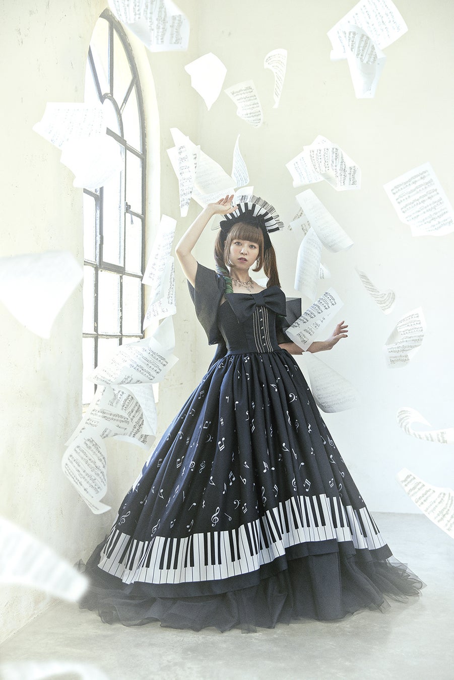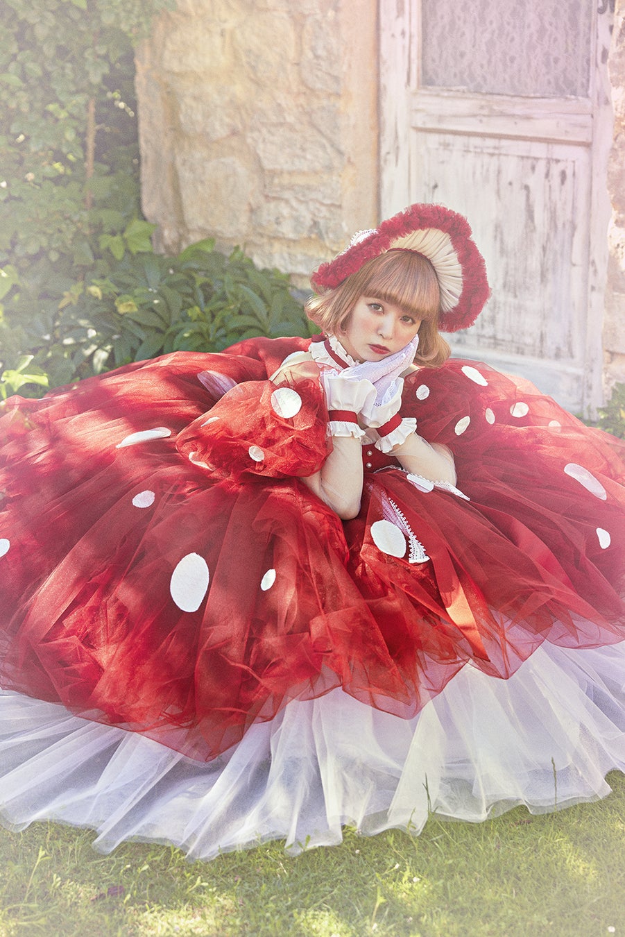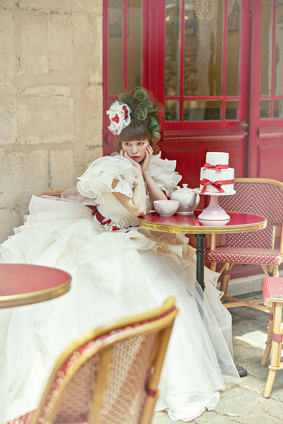 およそ1年ぶりとなる今作では、真っ白な生地に赤いリボンとヘッドドレスの苺が印象的なショートケーキドレスや、アイスクリームイメージのゆめかわドレス、さらにはきのこや鑑賞魚をイメージしたドレスに、アーティストらしいピアノモチーフの黒ドレスまで、バラエティに富んだ全5着を発表。同ドレスは、代官山 鳳鳴館をはじめサンセルモグループの式場にて今月からレンタルする事が出来る。