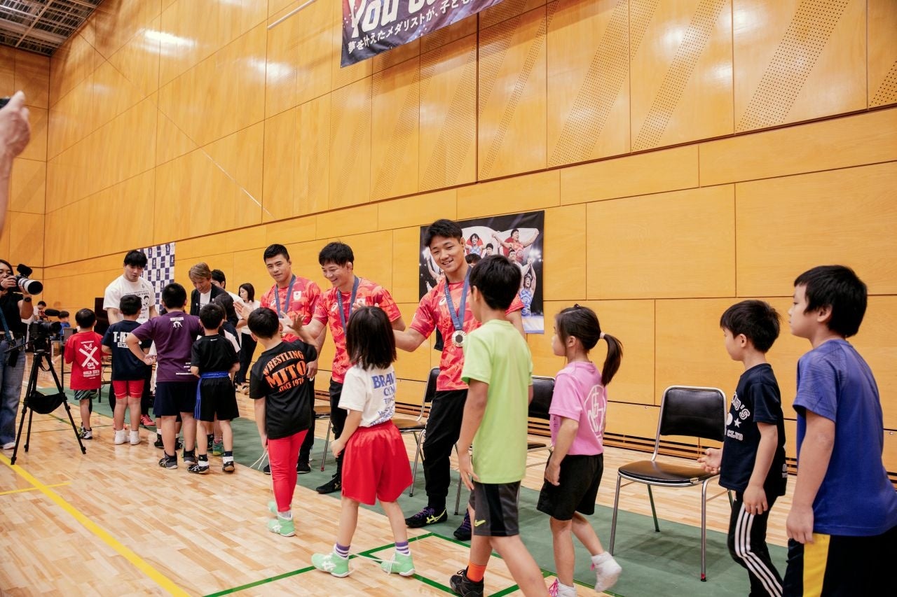 当日は、全国から100名を超えるジュニアレスラー(幼年~中学3年生)が参加。午前の部では、ゲストであるパリ五輪メダリストの文田健一郎(グレコローマンスタイル60kg級)、樋口黎(フリースタイル57kg級)、高谷大地(フリースタイル74kg級)らからジュニアレスターたちに特別技術指導が行われました。