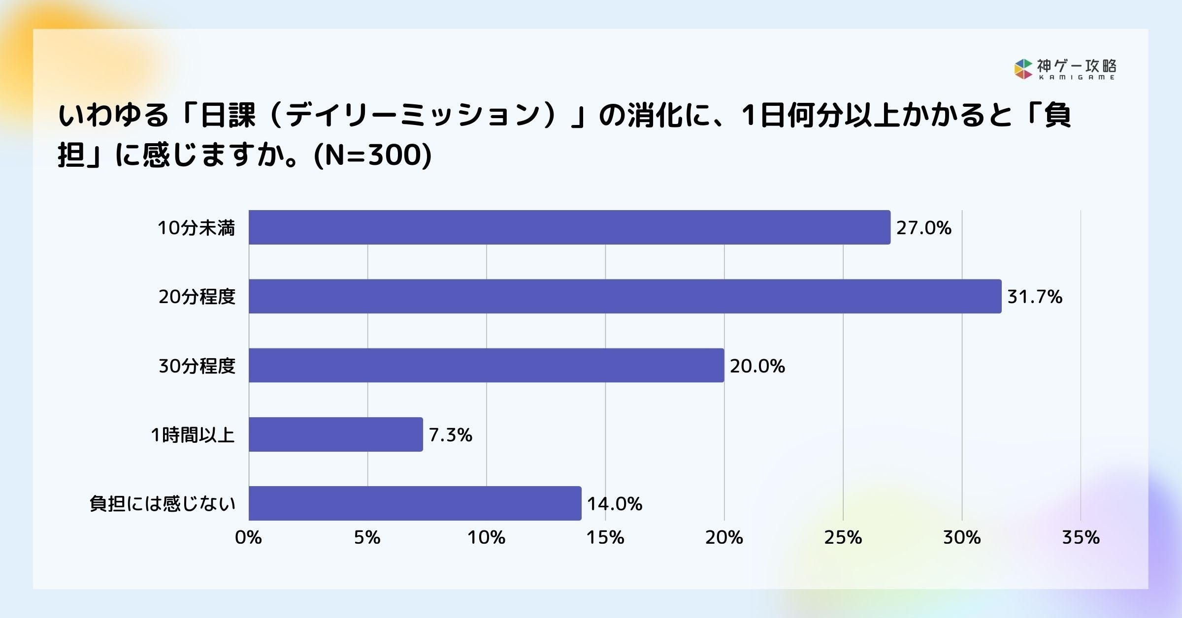 デイリーミッションなど、日課の消化については「20分程度で負担(31.7%)」が最多でした。 「10分未満(27.0%)」も多く、日々のプレイ時間が継続意向に影響する可能性が示されました。