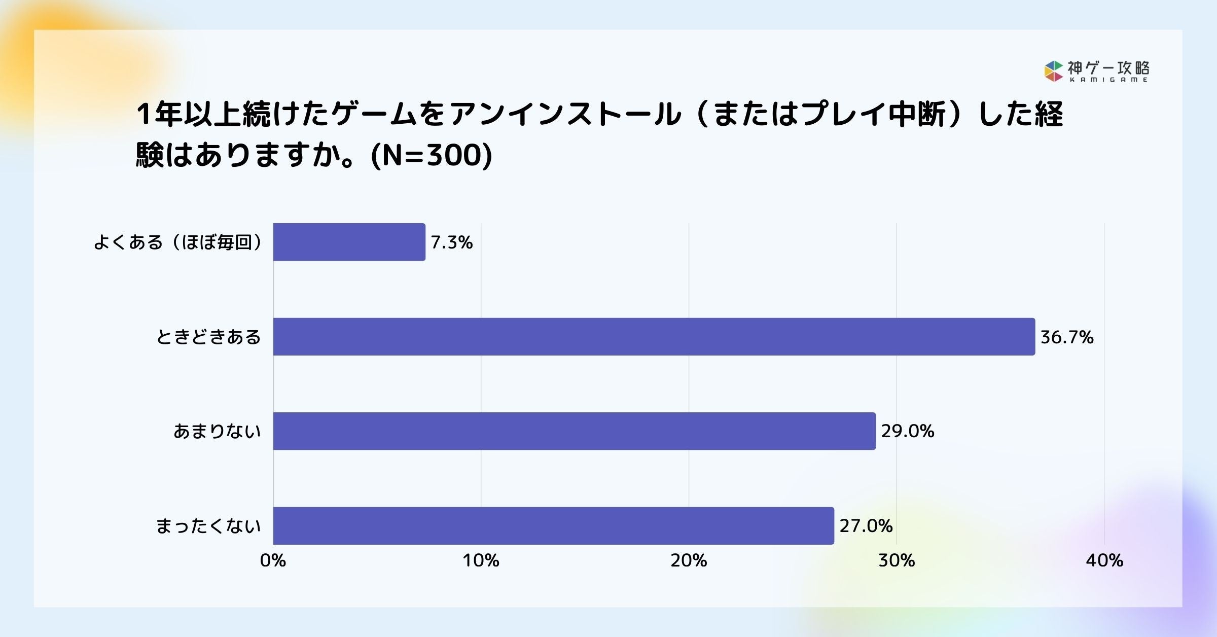 1年以上続けたゲームをやめた経験があるかという問いでは、「よくある(7.3%)」「ときどきある(36.7%)」を合わせると44.0%という結果でした。